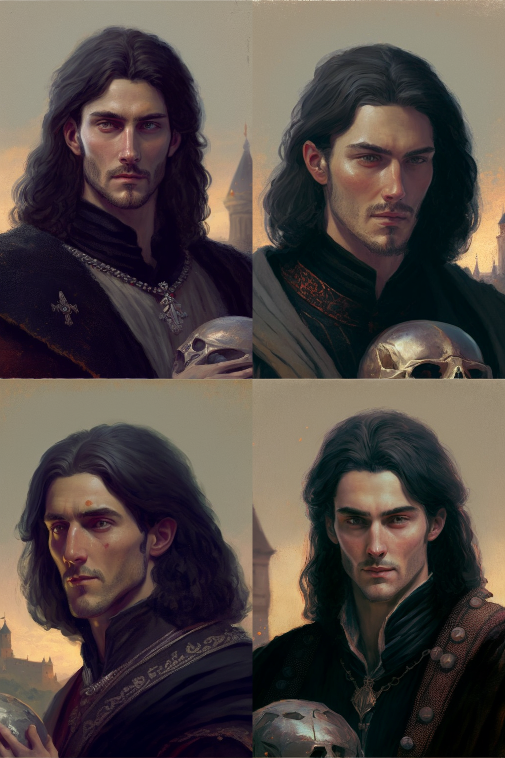 young king, nobleman, kind facial expression, pale skin, black hair, long hair, medieval style, 13th century, art, castle on the background, sunset, warm vibe, character concept --ar 2:3 --q 2 --v 4
