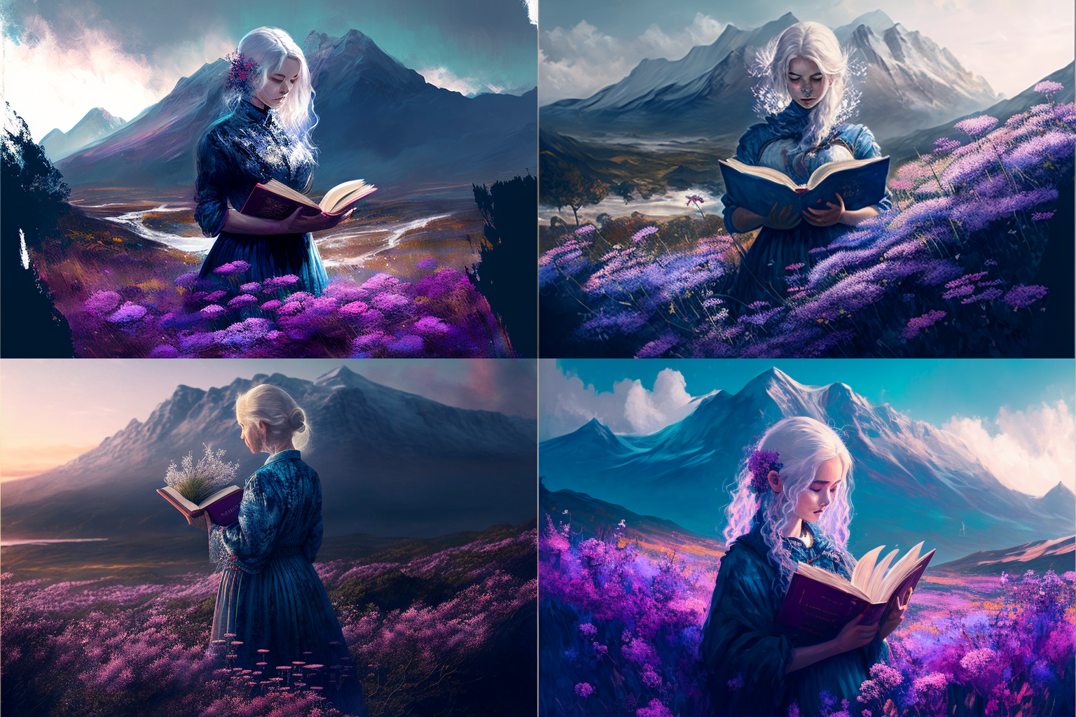 a field of flowering heather and silhouette of a beautiful woman with white hair in a blue dress on it, woman holding a book in her hands, mountains visible in the distance art --ar 3:2 --v 4