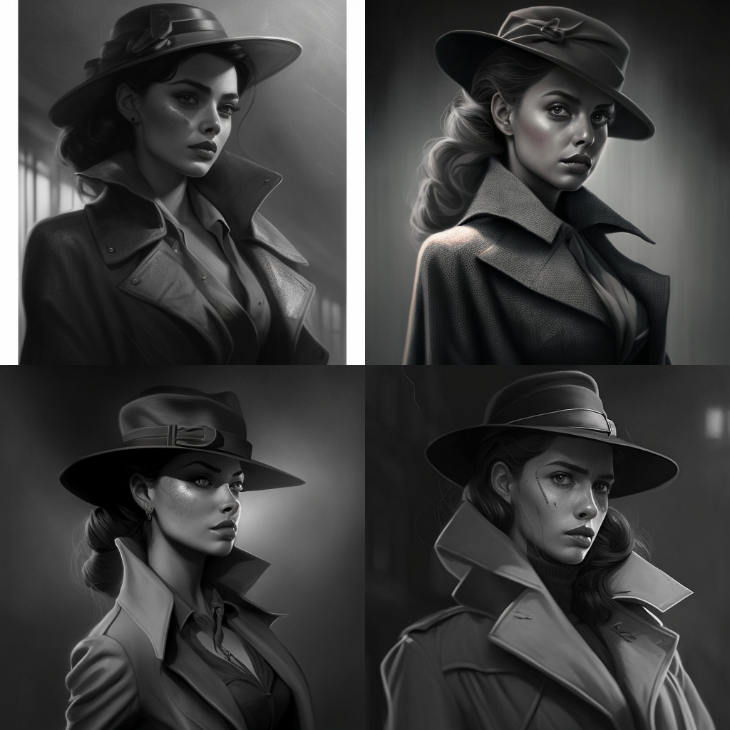 beautiful noir lady in hat, detailed face, detailed skin, amazing detail, perfection, new-york 40s, full body, grey cloak, character concept art --q 2 --v 4
