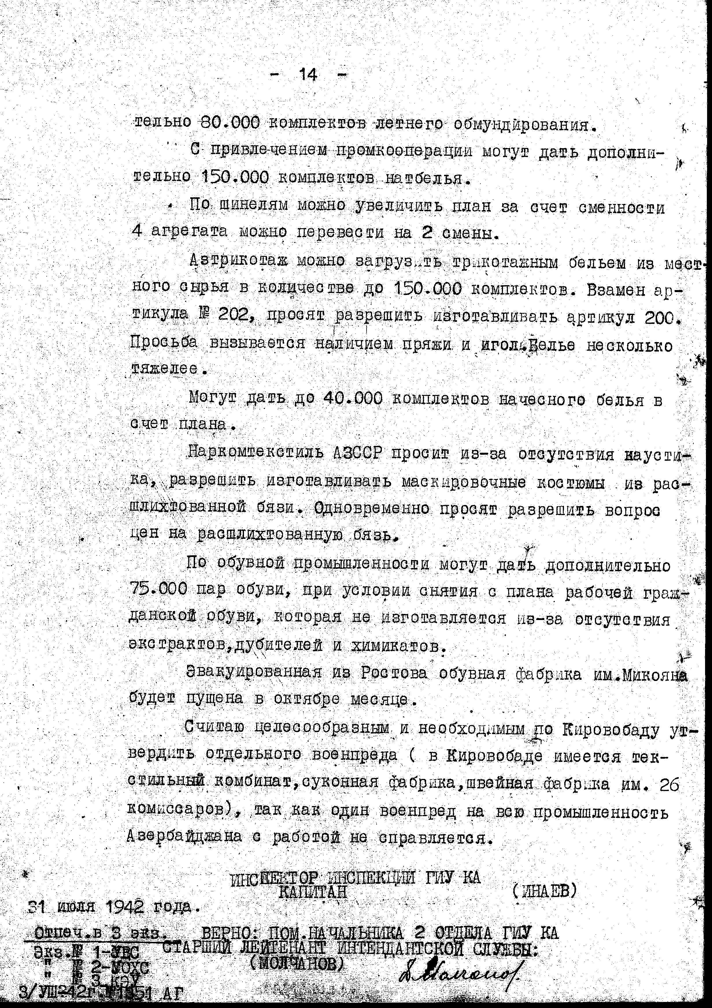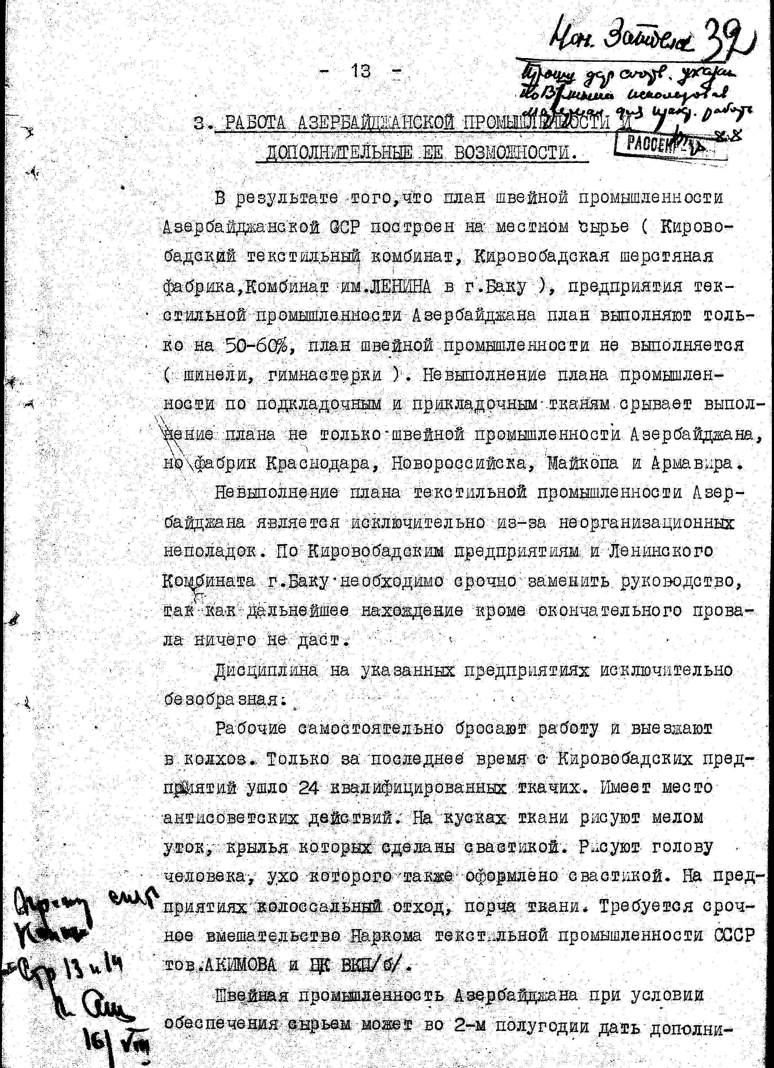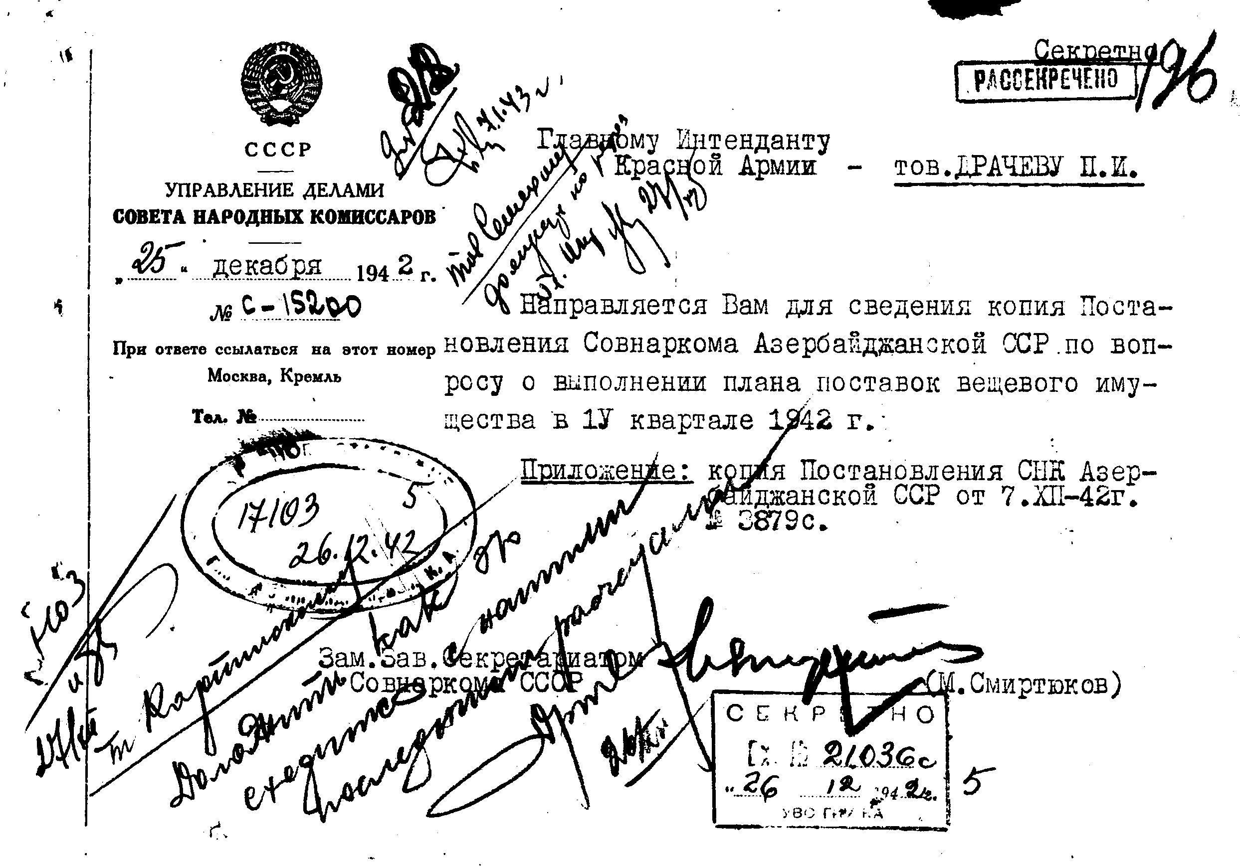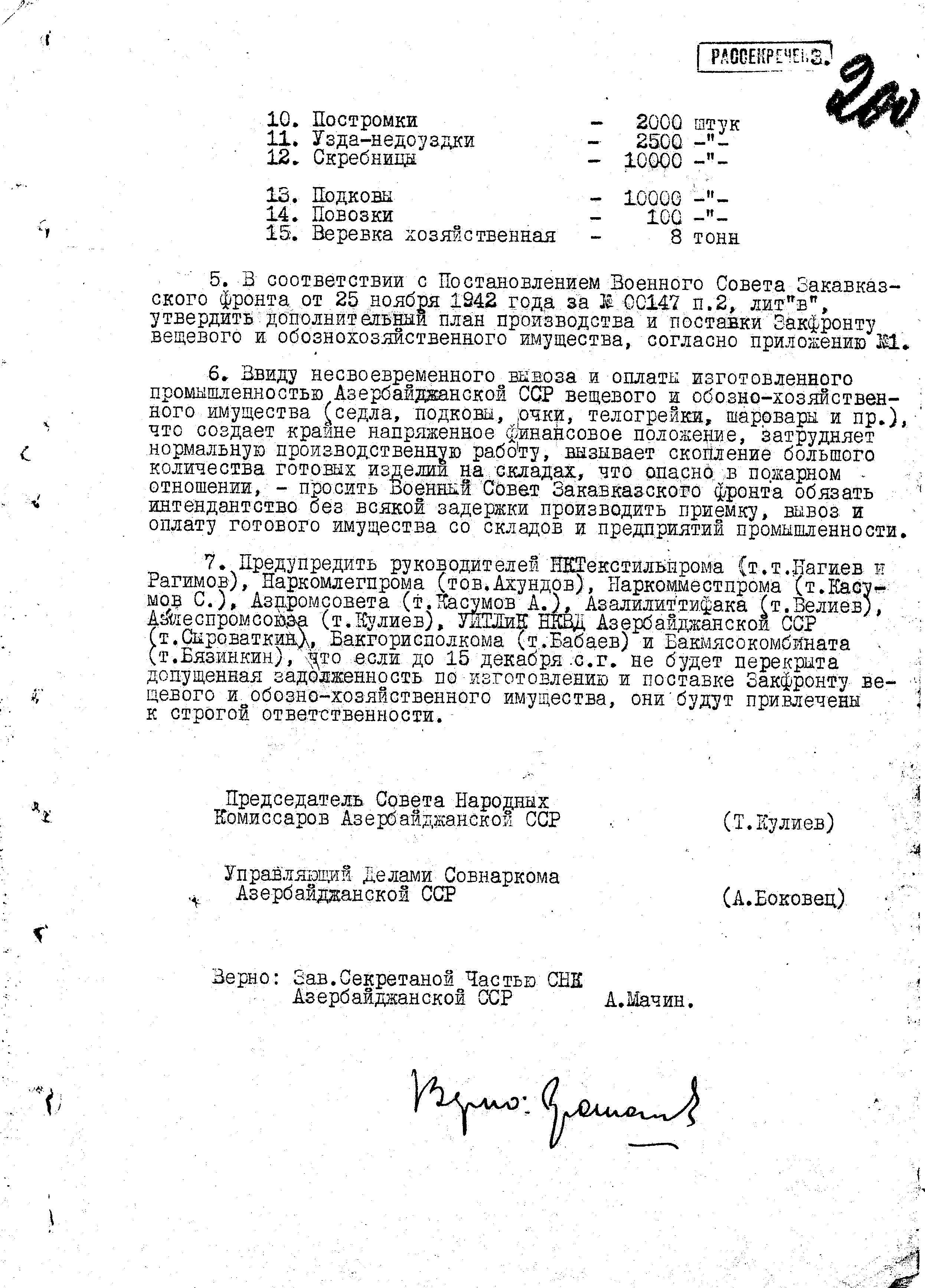 Не получилось бы и отмахнуться от излишне активного капитана, его правоту подтверждает, к примеру, Постановление Совета Народных комиссаров Азербайджанской ССР, в котором подтверждается аховое состояние выполнения промышленностью Азербайджана плана изготовления и поставок НКО вещевого и обозного имущества. Вот он: