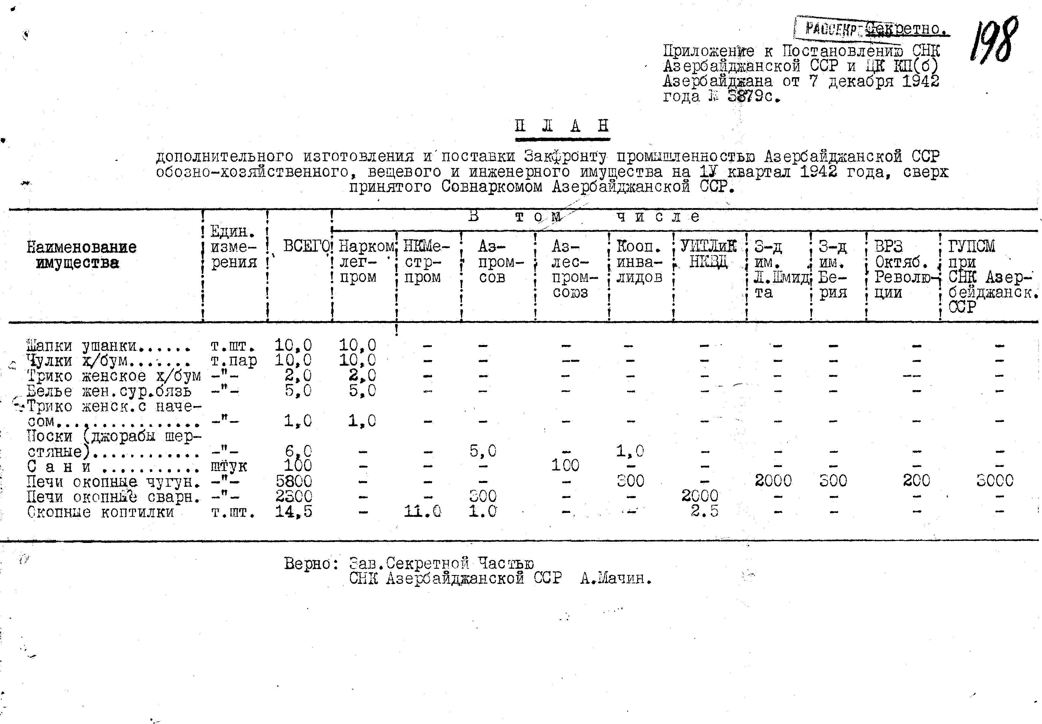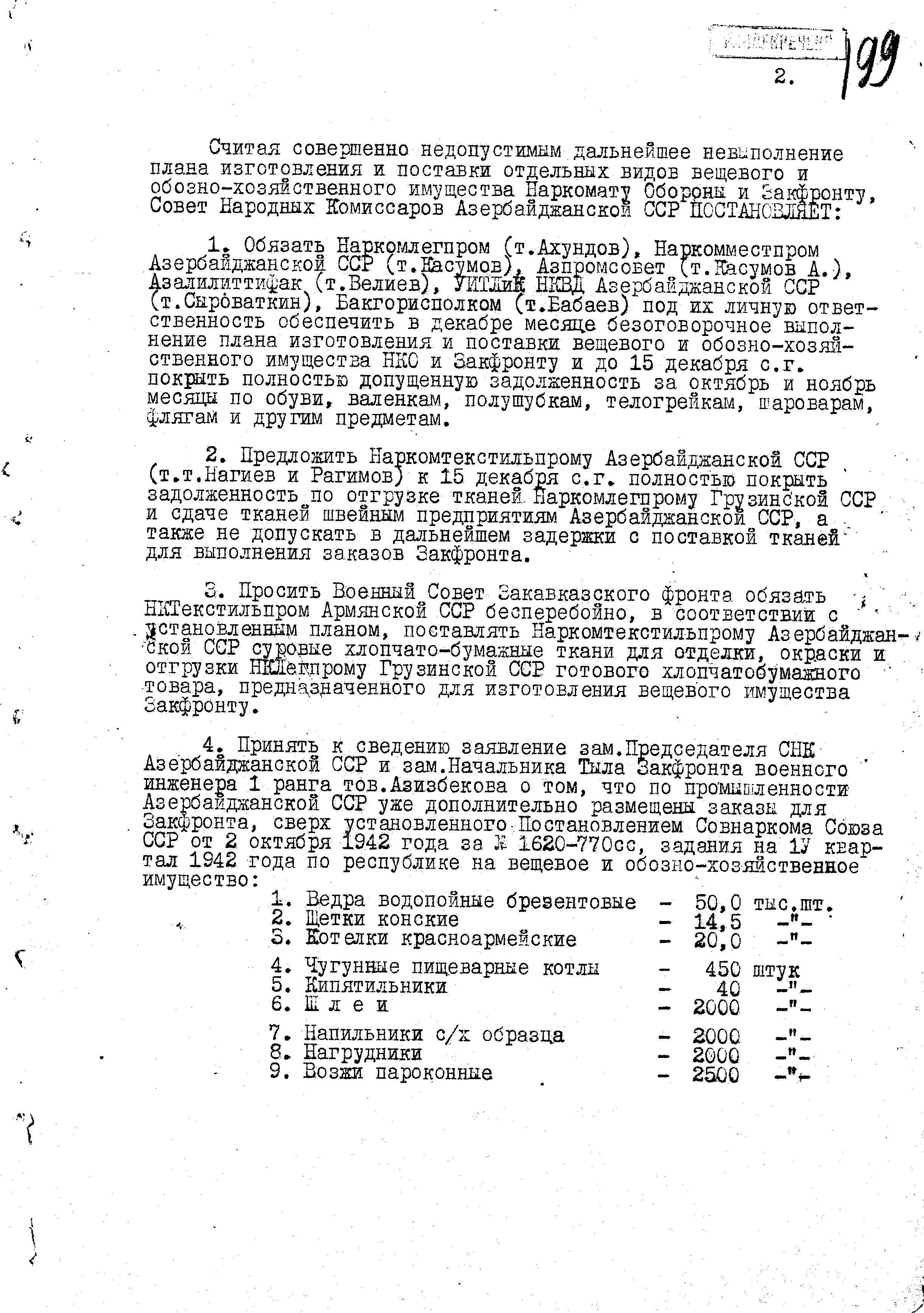 д/с: Постановление СНК Азербайджанской ССР «О выполнении промышленностью Азербайджанской ССР плана изготовления и поставок НКО вещевого и обозно-хозяйственного имущества за октябрь и ноябрь месяцы 1942 года.