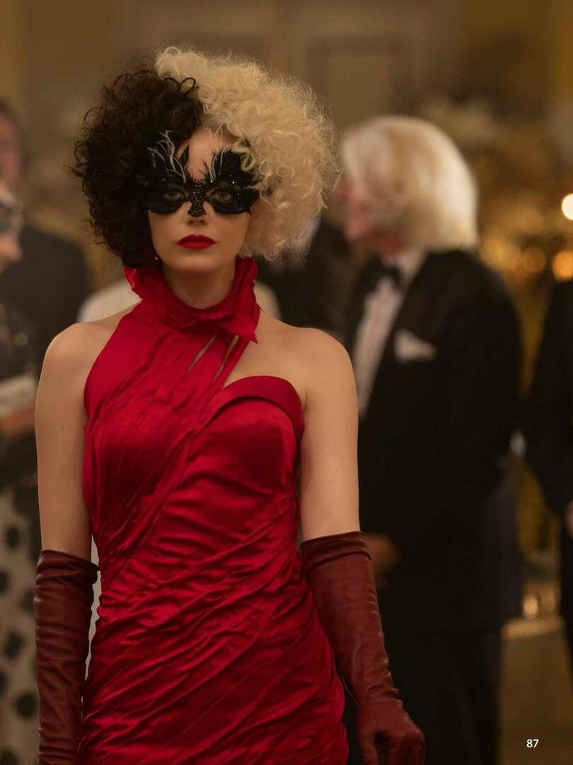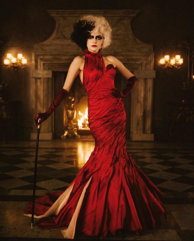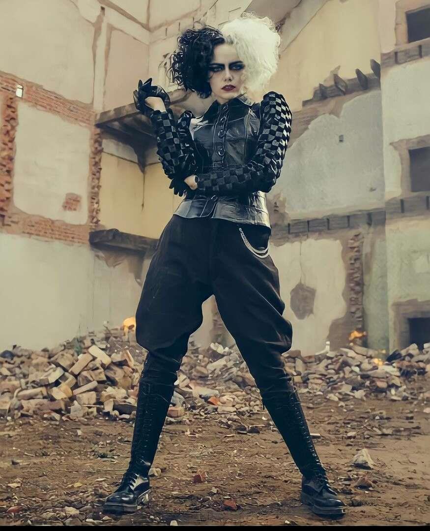 Главная героиня в исполнении Эммы Стоун — куда более сложная и интересная личность, чем однобокая злодейка из первоисточника. Нам с первых кадров намекают, что в душе девушки словно бы уживаются два совершенно разных персонажа: милая, светлая и добрая Эстелла и жестокая Круэлла. Воспитанная любящей матерью, Эстелла старается запрятать своё альтер-эго поглубже, и какое-то время это работает. Эстелла не выделяется из толпы, старательно работает и даже движется в направлении заветной цели. Однако она лишь обманывает и ограничивает себя.