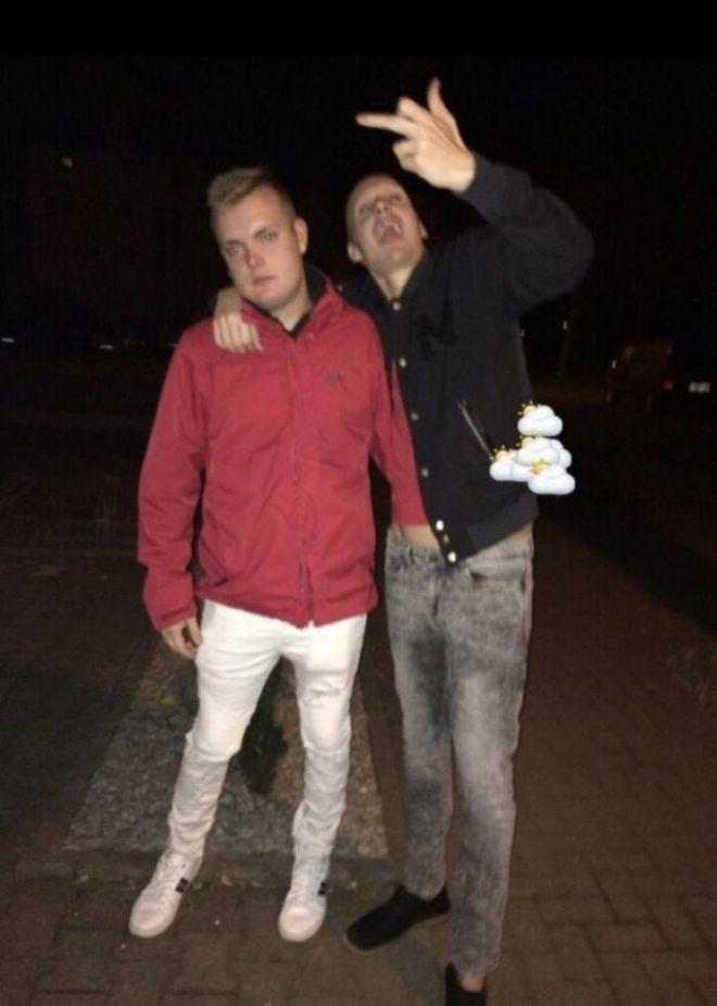 Не стоит думать о пошлом. Это не рука, а живот. Под курткой парня справа надета футболка такого же цвета как ветровка его друга слева.