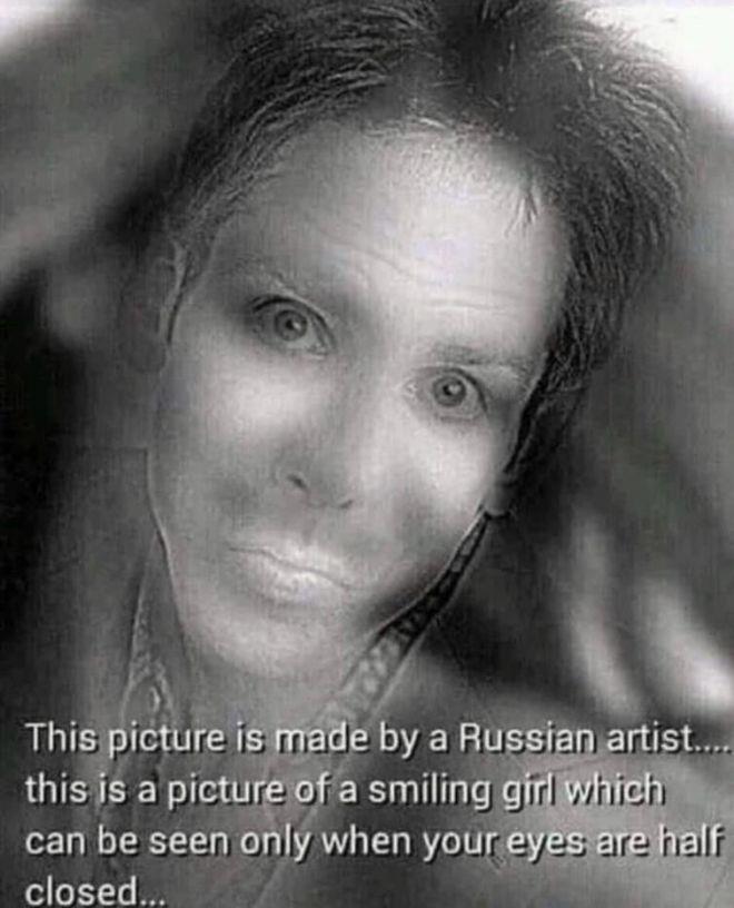 На фотографии запечатлена женщина, которая улыбнётся, если мы посмотрим на неё с полузакрытыми глазами.