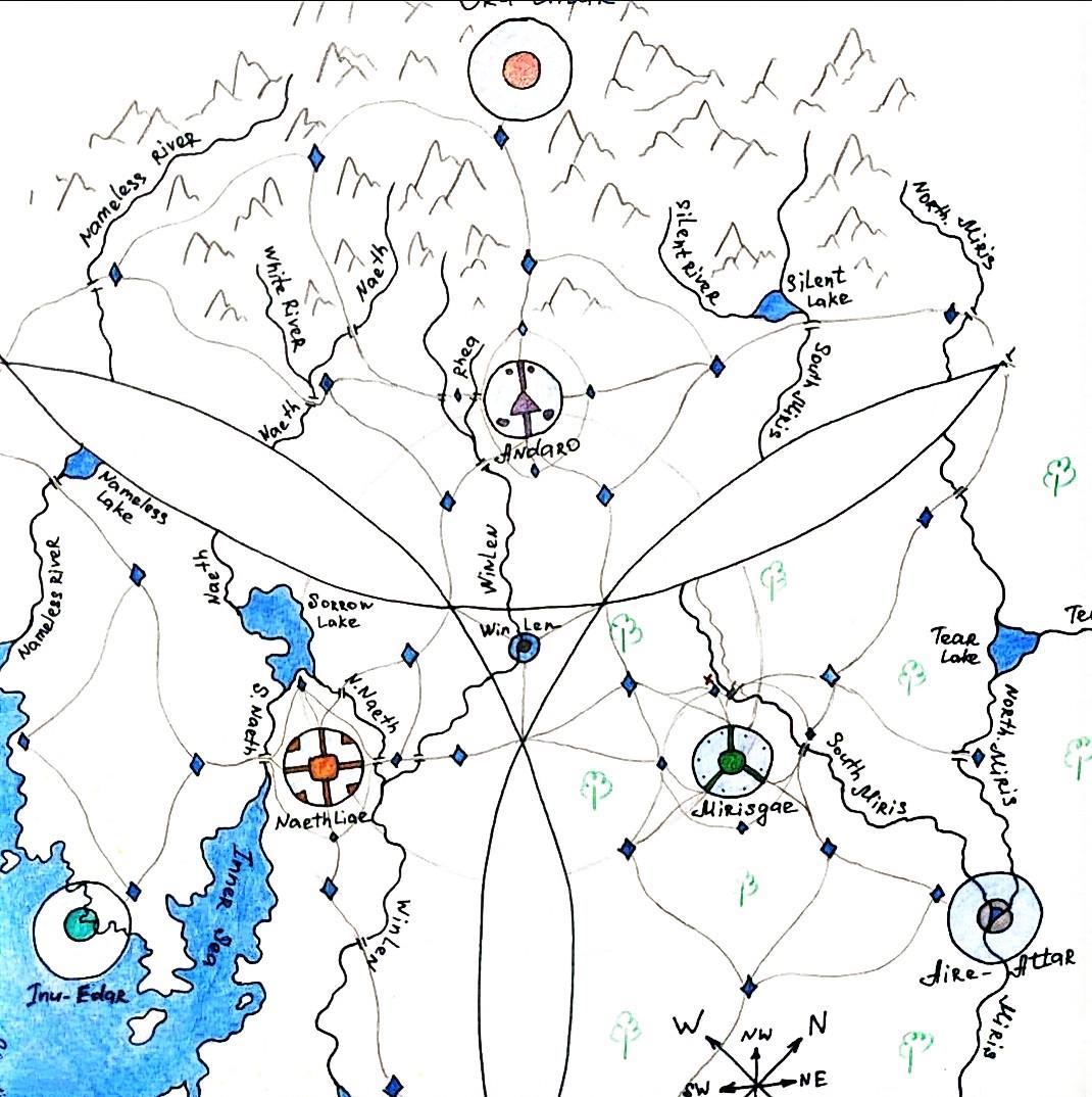 Здесь хочу сделать страшное признание: карта Аэд рождалась вследствие сюжета романа, а не наоборот. То есть протагонист, путешествуя, открывал мир для себя, читателя и даже писателя, потому что иногда я не знала, что ждет его там, за очередным поворотом дороги.