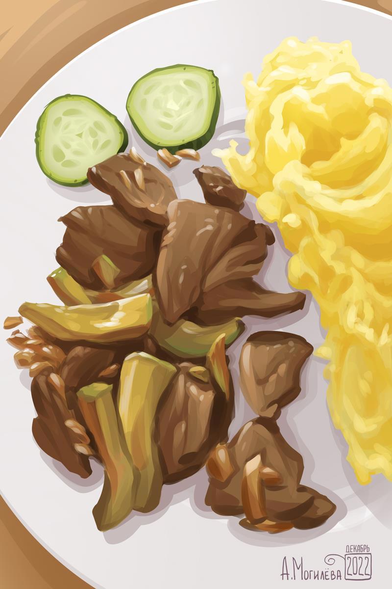 День четвертый. Картофельное пюре, огурчики и жареное мясо с луком и кабачками, 2 часа