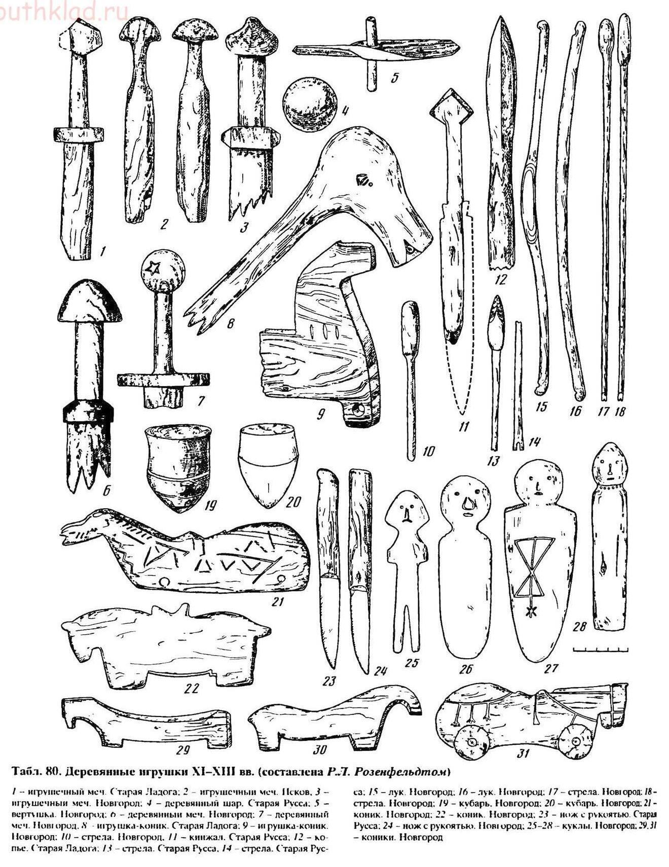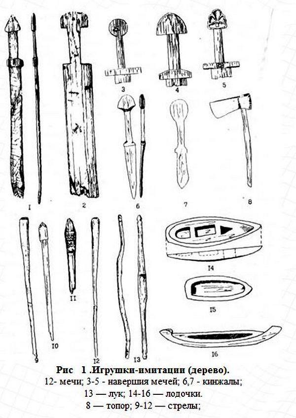 Археологи находят и уменьшенные копии оружия и орудий труда, которые относят к детским игрушкам. Например, во время раскопок в Новгороде было найдено очень много фрагментов таких изделий. При этом нужно понимать, что значительная часть предметов просто не могла быть уверенно определена, как остатки таких изделий, ведь они большей частью были сделаны из дерева. То есть «игрушек» было куда больше на самом деле. Говорят, что целый игрушечный меч за всё время был найден только один (помня своё детство, думаю, что это чудо). Вот небольшая подборка таких изделий из дерева: