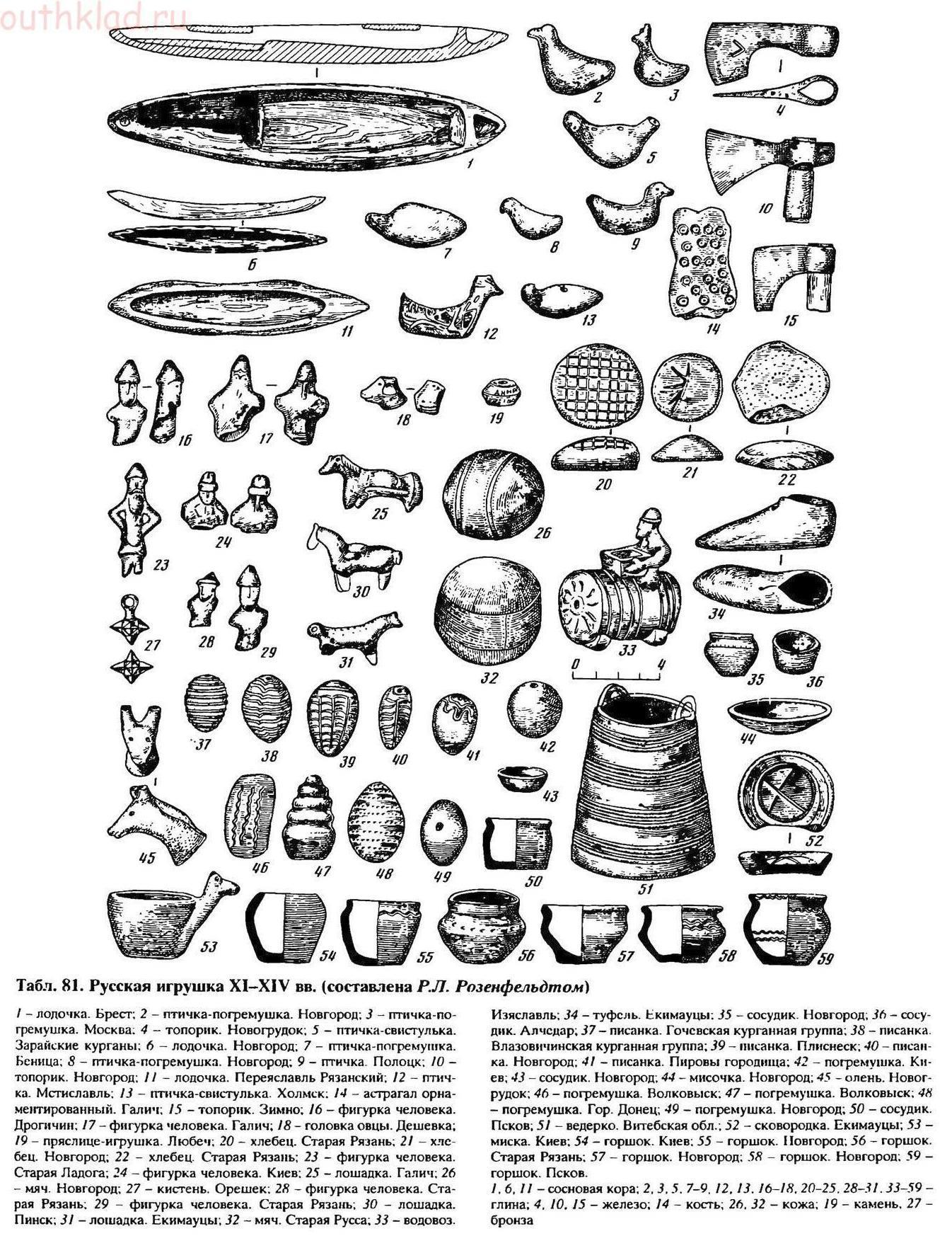 И вот недавно стал чистить свой архив (не в компе, а бумажный) и наткнулся на несколько листочков со своими рисунками, сделанными ещё практически в детстве, когда учился в «художке». Листочки выбросил, но всплыли мысли, которые когда-то посетили меня тогда, когда я увидел оригиналы, так сказать. Тогда я нарисовал пару-тройку работ, посвящённых русской истории. Одна так и осталась недоделанной. Это была батальная сцена «Битва на Калке». Понимаете, что нарисовать такое – нужно много фактического материала. Желательно подлинного. Это оружие, одежда, тактика, место, время… много всего. Вот и «копал». Попутно натыкался на всевозможные странности описания, нестыковки… а ещё на материалы сопутствующие, которые к делу прямо не относились, но заинтересовали. Это были, например, рисунки древних русских детских игрушек, найденных археологами в разных местах. В основном на Севере…