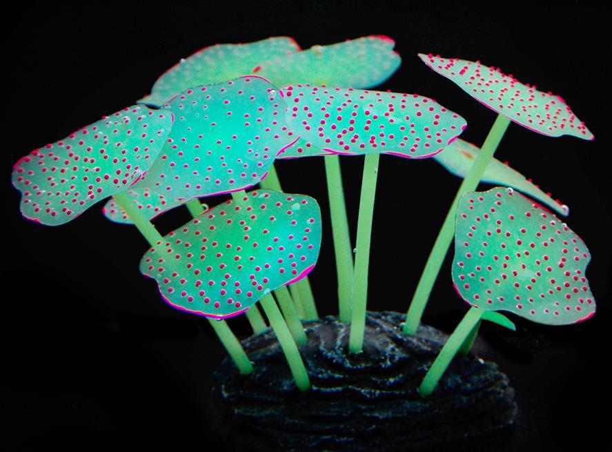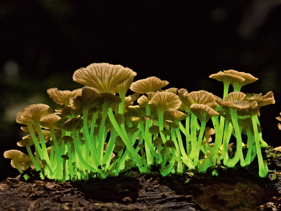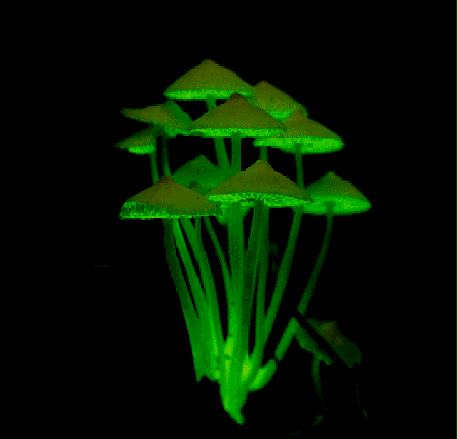 Биолюминесцентные грибы излучают зеленоватый свет с длиной волны 520-530 нм.