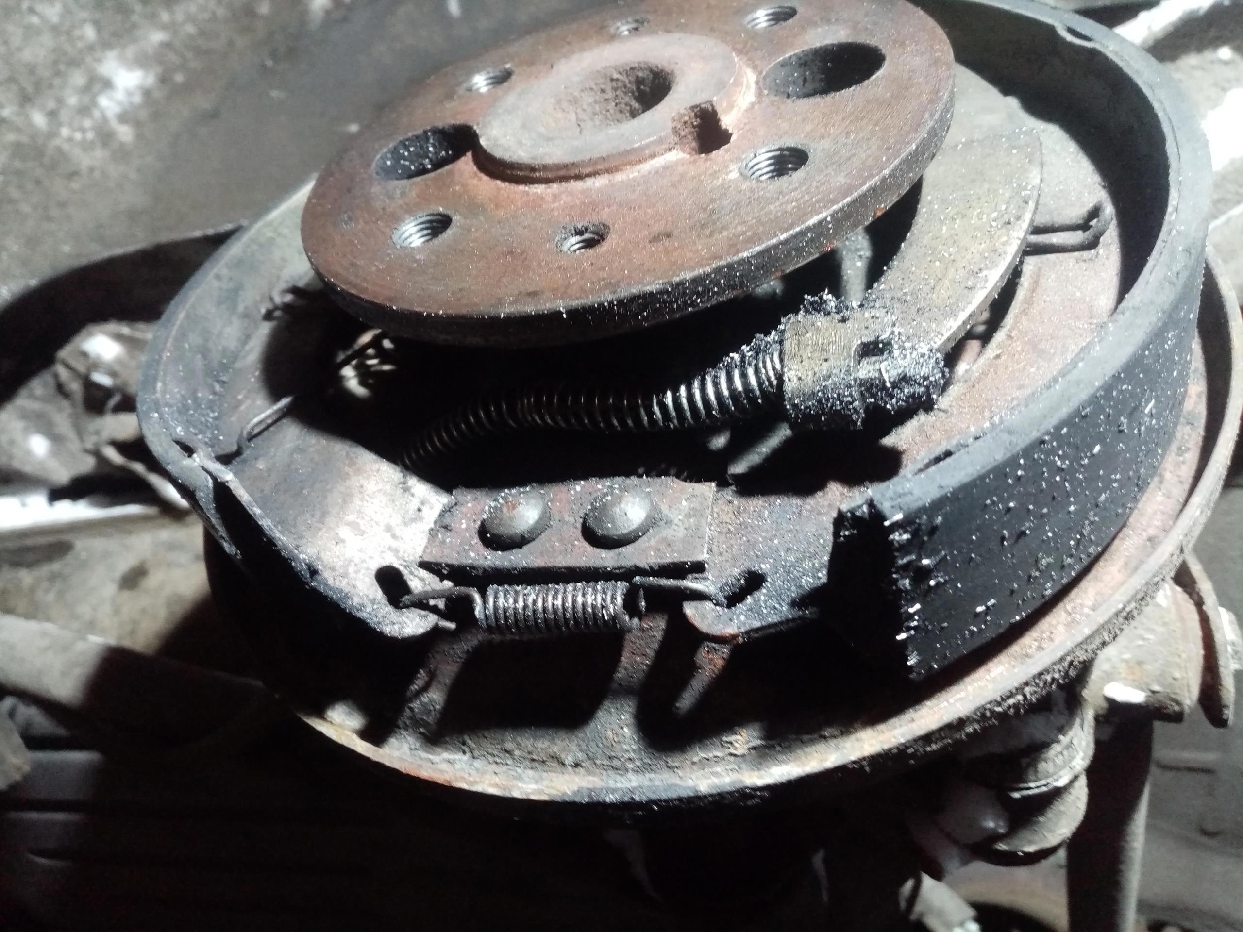 Вчера ездили с подругой на лёд, у неё наконец-то началась полноценная практика дрифта. Не обошлось без приключений. Сначала машина начала греться, как выяснилось - опять клинит термостат. Постучал по нему свечником - открылся вроде. Потом, уже перед выездом домой, поставили машину на ручник, сзади что-то щёлкнуло и ручник пропал. Ну ок, заедем на работу, выясним. При торможении появился скрежет сзади. No good.