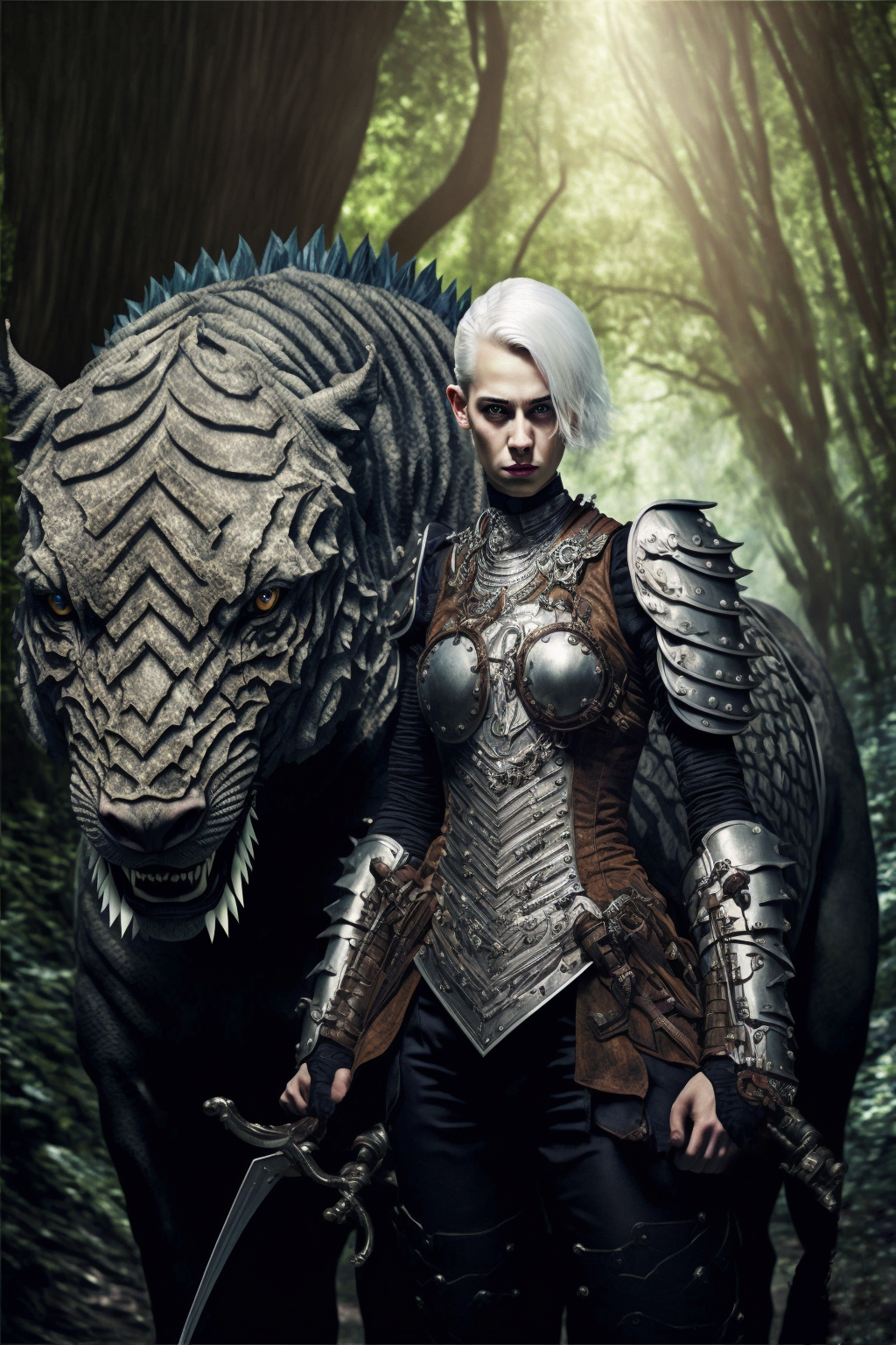 В кадре — главная героиня Кай Ковач и её фергат. Конечно, с руками нейросеть работает ещё не слишком хорошо, да и доспех должен был быть не затейливо-фэнтезийным, а простым, кольчужным. Зато котик удался.