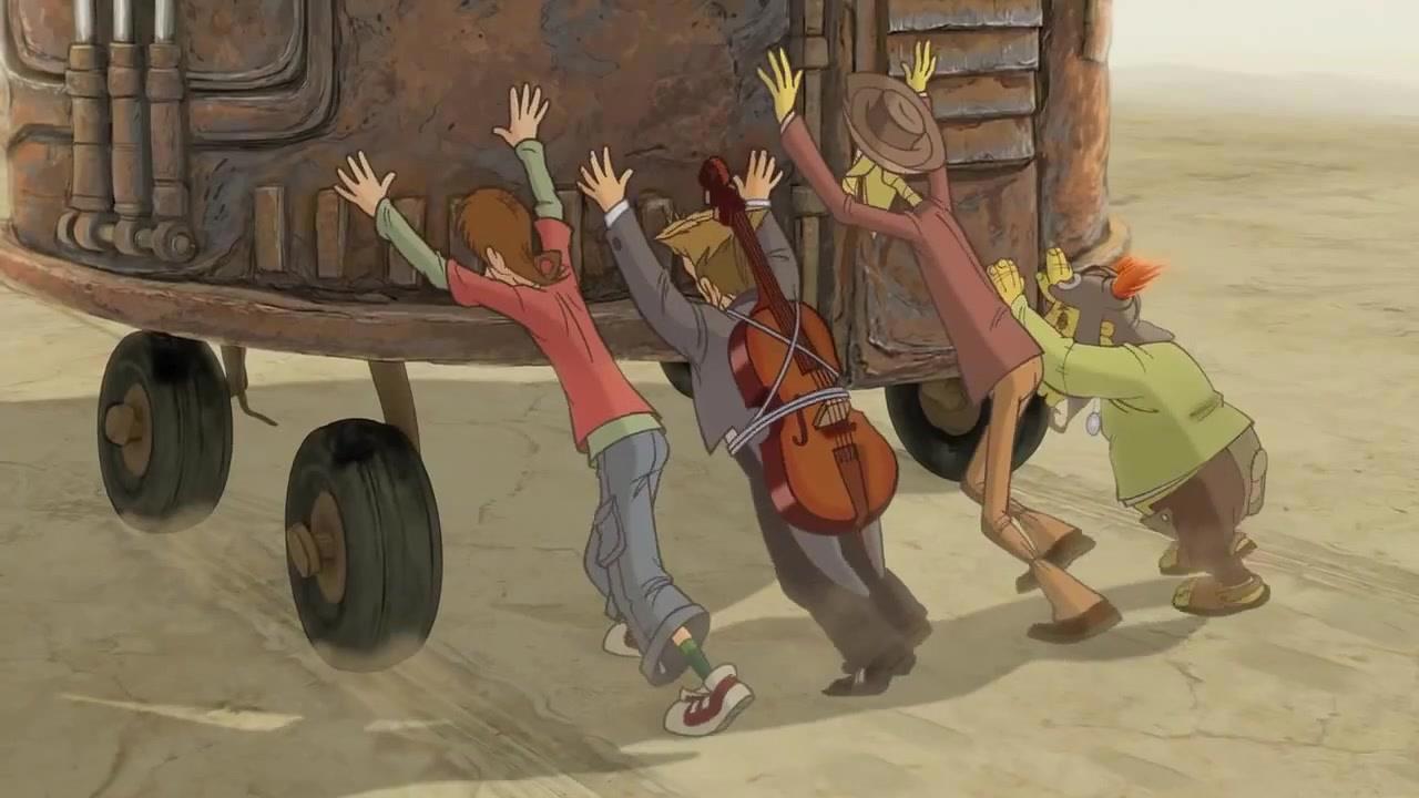 3. Если честно, то в фильме персонажи увлекали собой и им неосознанно сопереживаешь. Мне кстати было больше жалко Уэфа и Би, а не Прораба и Скрипача (связались же бедные артисты с пришельцами с земли, незнающими даже перед кем нужно приседать!) Тут персонажи не вызывают никаких симпатий и сопереживания к ним не почувствовал. Уэф и Би выглядели как жалкие пародии на своих прототипов из фильма, они просто стали бесцветными. Новый Скрипач вызывал у меня ощущение брезгливости (полный идиот с гигантским ЧВС), а новый Прораб – антипатию (этакий современный подросток, разговаривающий на сленге и ведущий себя то умно, то придурковато). Вот это и есть преломление как в кривом зеркале: умный, но эмоционально несдержанный «клептоман» Скрипач из первого фильма деградировал в взрослого инфантильного идиота, а строгий, ответственный и четкий на все случаи жизни Прораб – в незрелого неврастеничного подростка. Однако если быть не слишком строгим, то две капельки симпатии во всем мультике есть и их вызывают два второстепенных персонажа: робот, что служил Уэфу и Би (добавили в сюжет) и маленькое существо, что слушало в пустыне игру на виолончели Скрипача (Чиката-чиката-чиката-та).