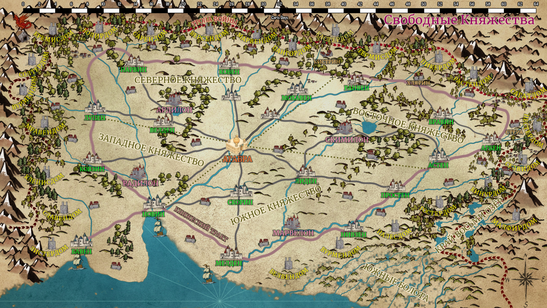 Шкала вверху нарисована в днях пути на повозке (каждое деление - 2 дня). Сделано в специализированном редакторе Wonderdraft.