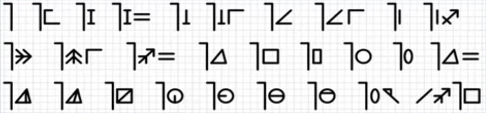 Подсказки: первый символ/слово в первой строке означает одномерные (линейные) объекты нашего мира. Второй знак в след. слове означает очень малое значение, знак = - тоже что и в нашем языке, третий знак в шестом слове означает первый, начальный, последний знак в первой строке - прямой, двойные стрелки во второй строке - вправо, вверх, вперед, последний символ в предпоследнем слове третьей строки - часть, знак / - действие.