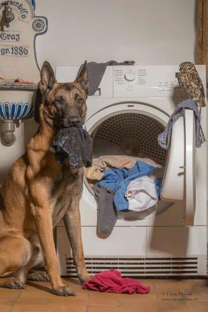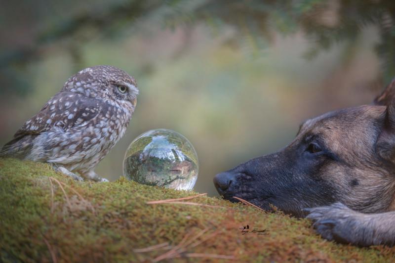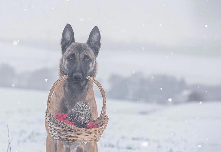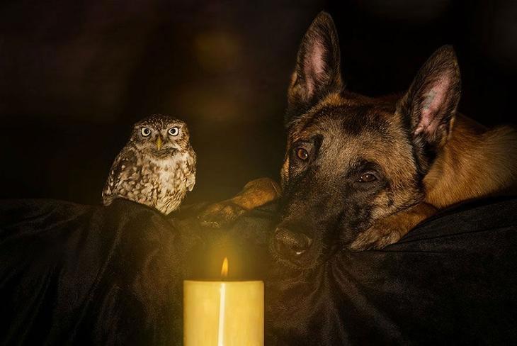 В Интернете можно найти немало трогательных фотографий, иллюстрирующих «дружбу» различных животных. Чаще всего, конечно, общий язык находят домашние кошки и собаки, которые вопреки общепринятому мнению, совсем неплохо ладят. Эта немецкая художница и фотограф проиллюстрировала невероятную историю взаимоотношений совы и собаки.