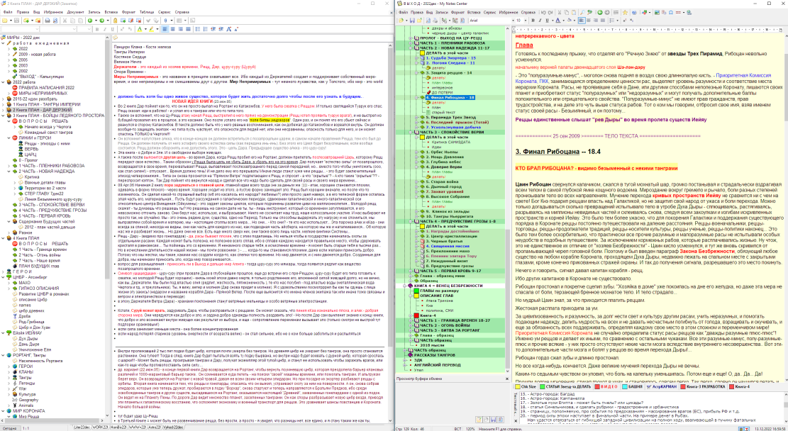 Потому в работе одновременно открываю на мониторе два текстовых органайзера - в одном пишется книга (1027 записей сейчас), а в другом справочный материал (791 запись). Вот так это выглядит: