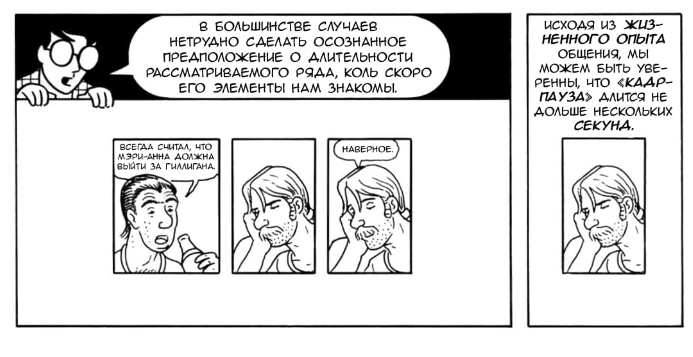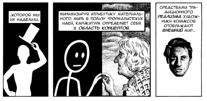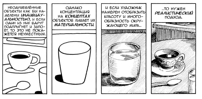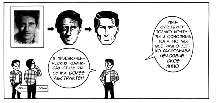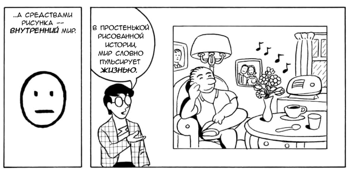 Вторая глава посвящена такому интересному явлению, как "домысливание". Да, там это рассказывается именно в контексте комикса, но это все легко переносится на роман или фильм. Есть две сцены и они имеют логическую связь. То, что между сценами, читатель домысливает сам. Причем существует несколько видов связи, и очень интересно то, что в западном мире используются одни виды связи, а в Японии и вообще, Азии, традиционно используют другие виды связи, что характеризует разницу между восточным и западным мышлением.