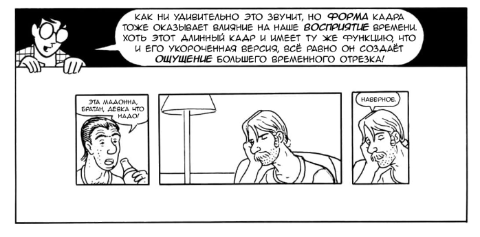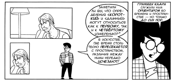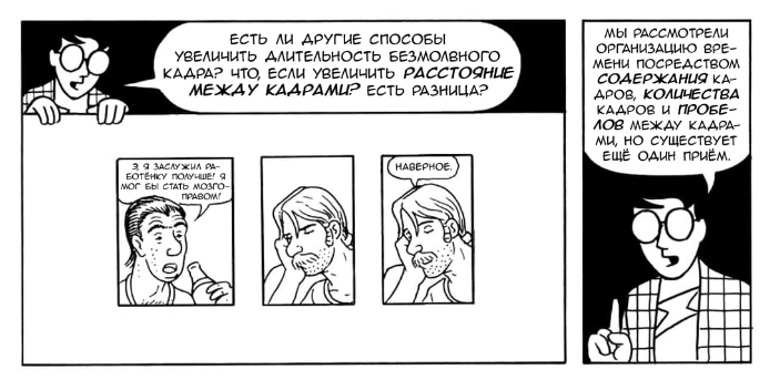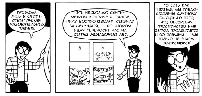 В третьей главе рассказывается о том, как работает время и как оно работает в комиксе, как его можно показывать и говорится о линейности и разветвленности событий.