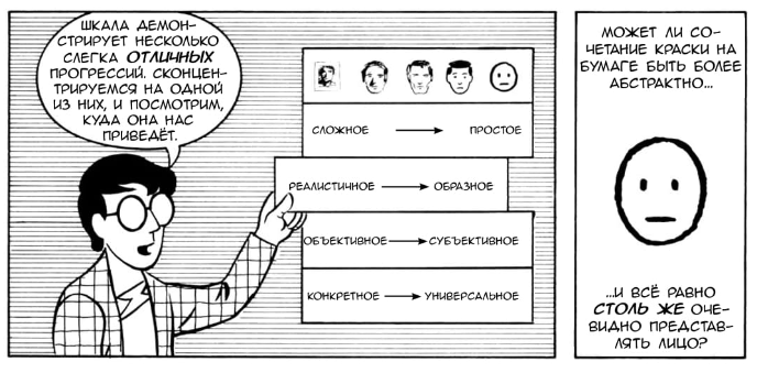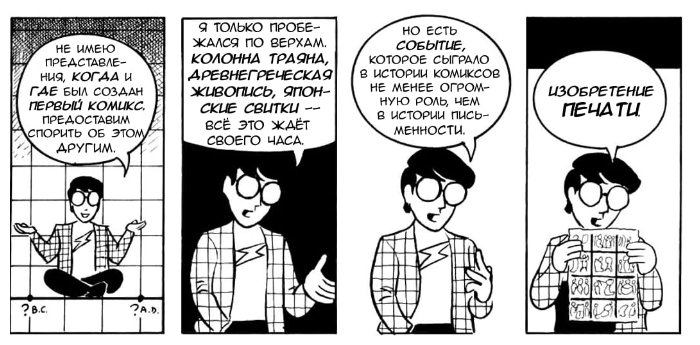 В первой главе Скотт Макклауд рассказывает об истории комиксов. Ну здесь, как бы мы все понимаем, что древнеегипетские картиночки были одними из первых комиксов, но все намного интереснее.