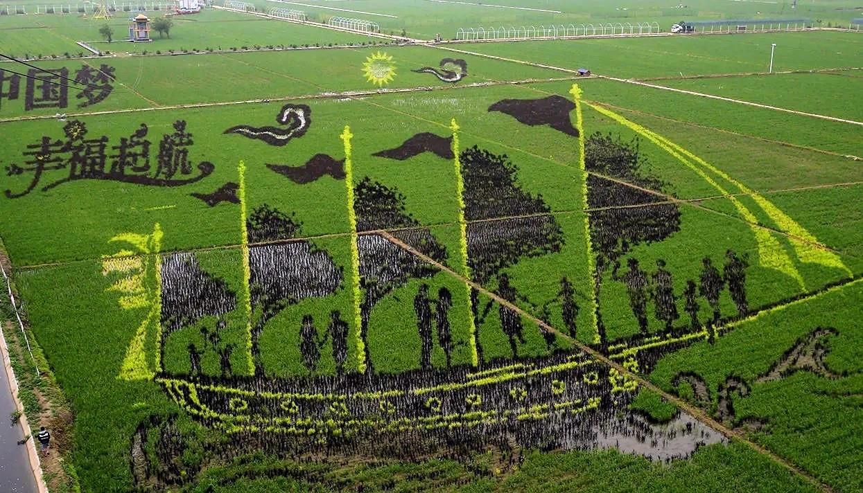 Каждый год перед посадкой риса они выбирают художественный образ и воплощают его на поле, используя сорта риса разных цветов.