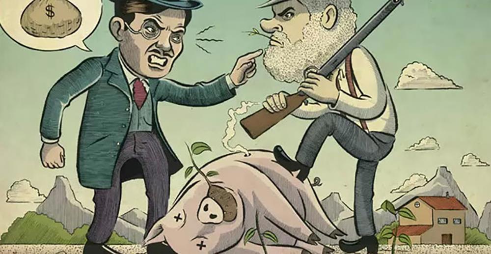 15 июня 1859 года Лайман Катлар, американский фермер, переехавший на остров Сан-Хуан, обнаружил свинью, копающуюся в его огороде и поедающую картошку. Это был не первый рейд на огород, Катлар схватился за ружье и вскоре одной свиней на острове стало меньше. Однако история только начиналась. Остров Сан-Хуан был спорной территорией между США и Канадой, а эта конкретная свинья принадлежала ирландцу Чарльзу Гриффину, нанятому компанией Гудзонова залива для присмотра за овечьим стадом. Видимо, присмотр за овцами компании отнимал у ирландца все время, потому своим свиньям он позволял гулять где угодно – остров же. Катлар предложил Гриффину 10 долларов (примерно 300 долларов сейчас) в качестве компенсации за свинью, но Гриффин был недоволен этим предложением и потребовал 100 долларов (3000 долларов по нынешним ценам). После этого ответа Катлар решил, что ему вообще не нужно платить за свинью, потому что мерсское животное вторглось на его землю.