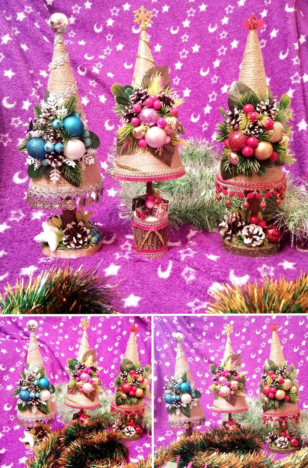Все украшения стоят на полочках и висят на стенках, но ради поста я решила красиво их сфотографировать и даже составила коллажи. Ёлочки сестра делает на любой вкус и цвет. В прошлом году я делала гиф-анимацию с ёлочками, но не нашла