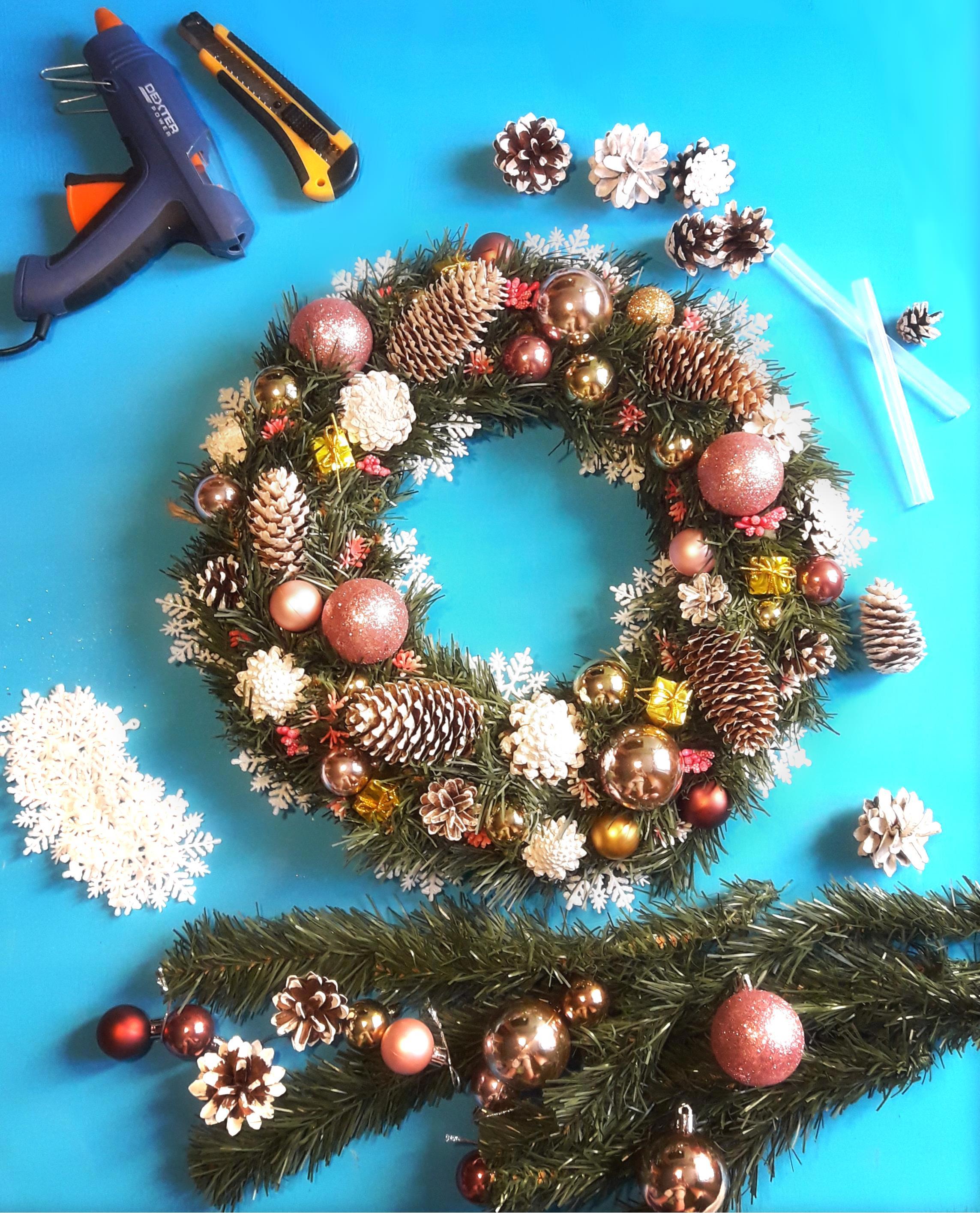 Вот такой венок сестра сделала в прошлом году. И он отлично сохранился) Натуральные шишки здорово сочетаются с обычными шариками и ёлка выглядит как настоящая (хотя это не так).