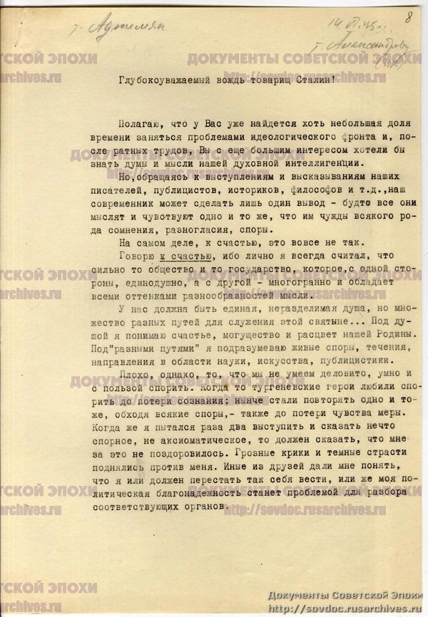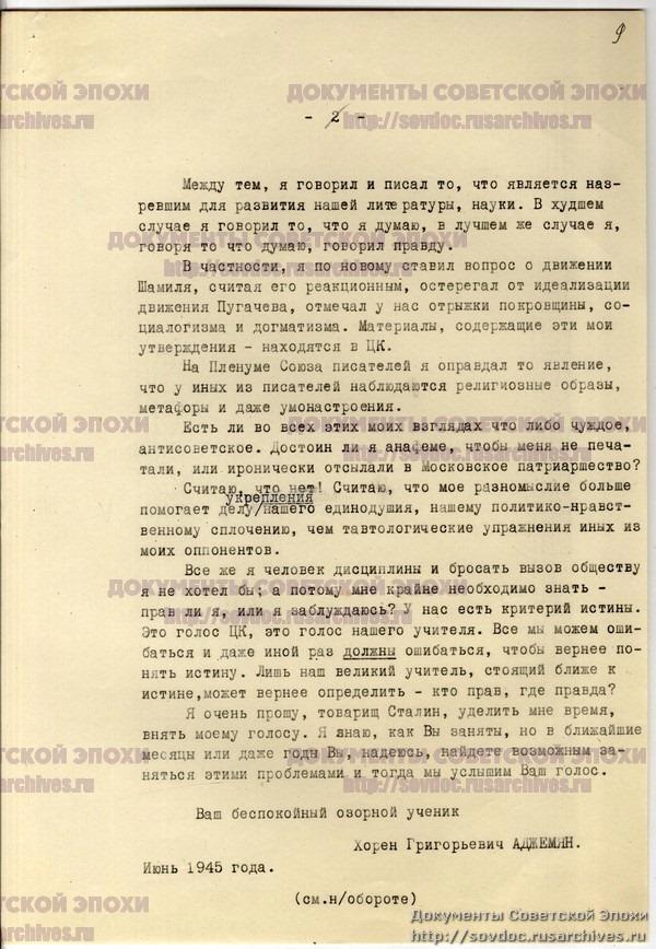 А вот любопытное письмо, отправленное Хореном Аджемяном в июне 1945 года товарищу Сталину: