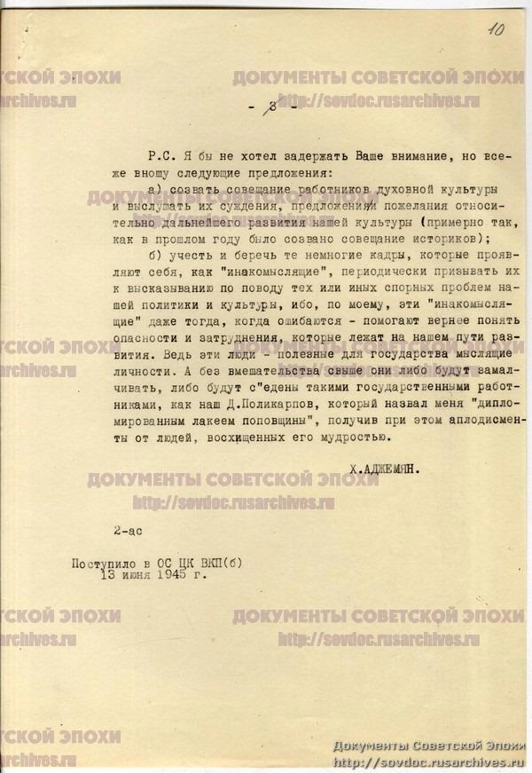 Лично я о нём узнал как раз когда готовил книгу о Жданове – этот товарищ Аджемян в разгар сталинизма свободно гнал такое, что это даже не удивительно, а почти фантастично звучит для сталинской эпохи…