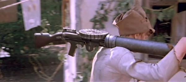 Но увидеть его можно во многих "революционных" фильмах. Тех самых истернах, о которых я писал в прошлый раз. Всё дело в том, что под него относительно легко замаскировать ручной пулемёт Дегтярёва, которых тысячами клепали во время Великой Отечественной. Выручала конструкция магазина в виде металлического диска, крепящегося наверху, и здоровенной трубы кожуха, полностью закрывающего ствол.