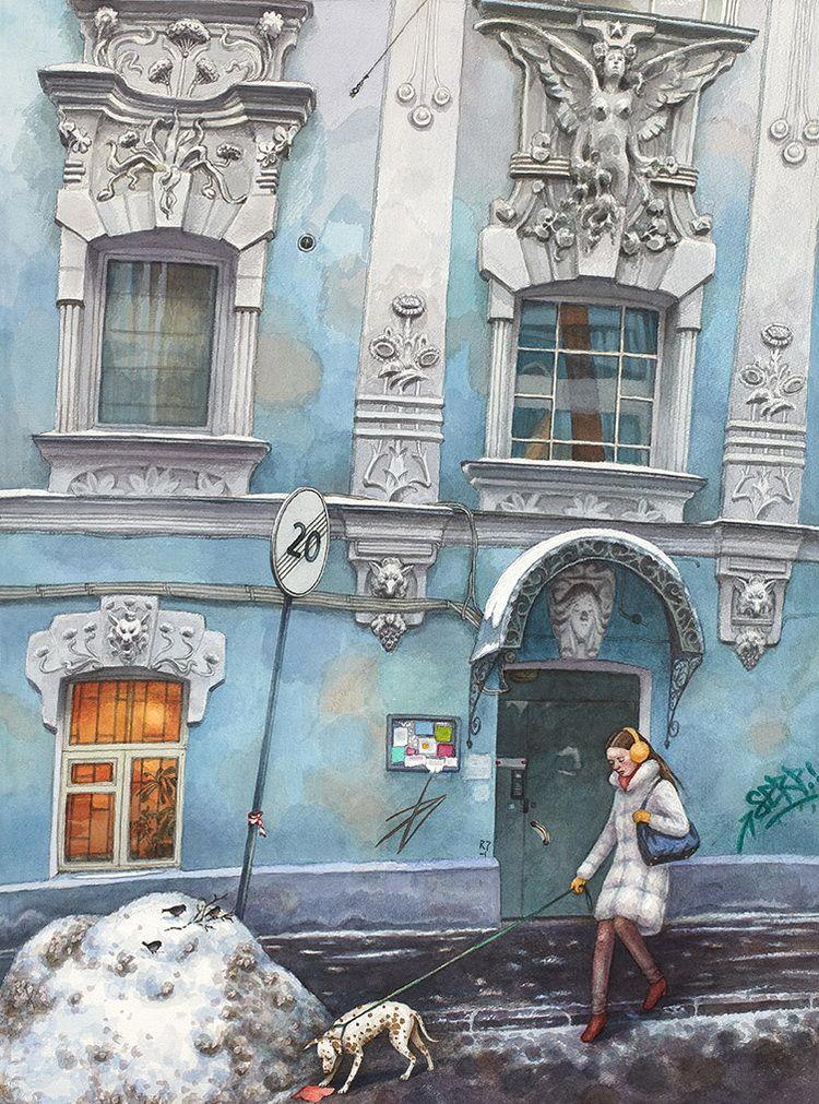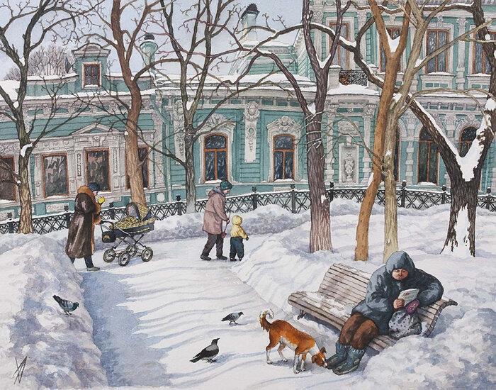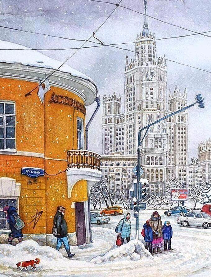 N.B. Я не был коренным москвичем. Но я прожил в этом непростой городе много лет. Я его полюбил. Как и любой мегаполис, Москва может быть жестокой к приезжим. Но она также и много даёт. Короче я прожил там много хороших лет. И я её люблю до сих пор. Я её не видел уже лет тридцать. И поэтому с удовольствием смотрю на картины, посвященные Москве, которую мы любим. Сегодня я узнал о двух новых для меня художника, творчество которых по типу полностью посвящено Москве.