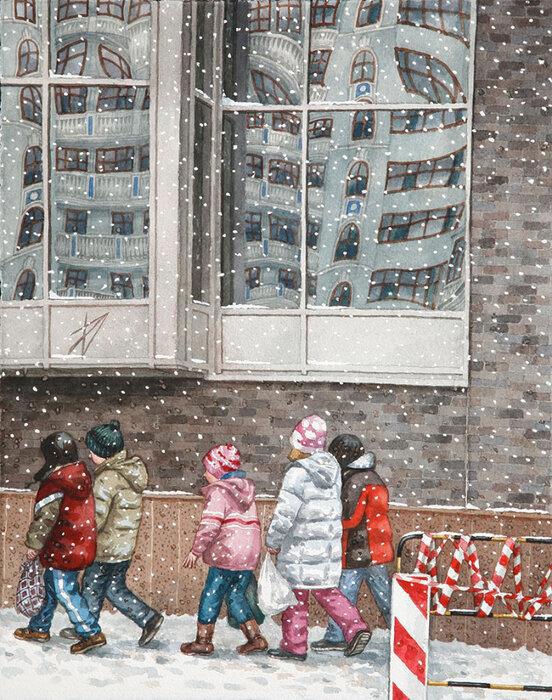 А люди на ее работах - это небольшие, но важные акценты - со своим характером, бегущие куда-то по делам, меланхолично выхаживающие вдоль домов, они подчёркивают колорит каждой отдельно взятой работы, но являются второстепенными персонажами.