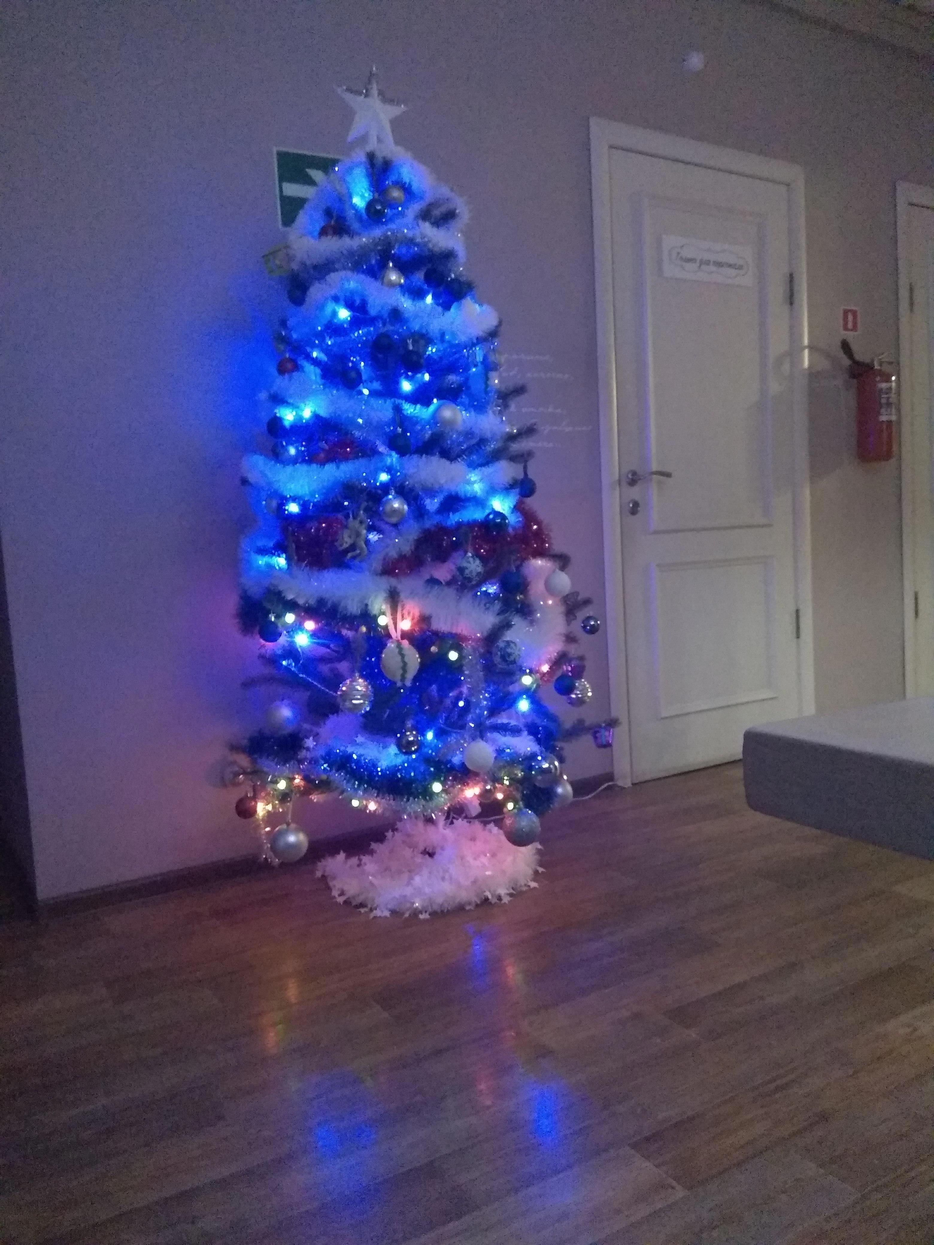 В нашей полугостинице поставили ёлку. Она блещет разноцветными огнями.