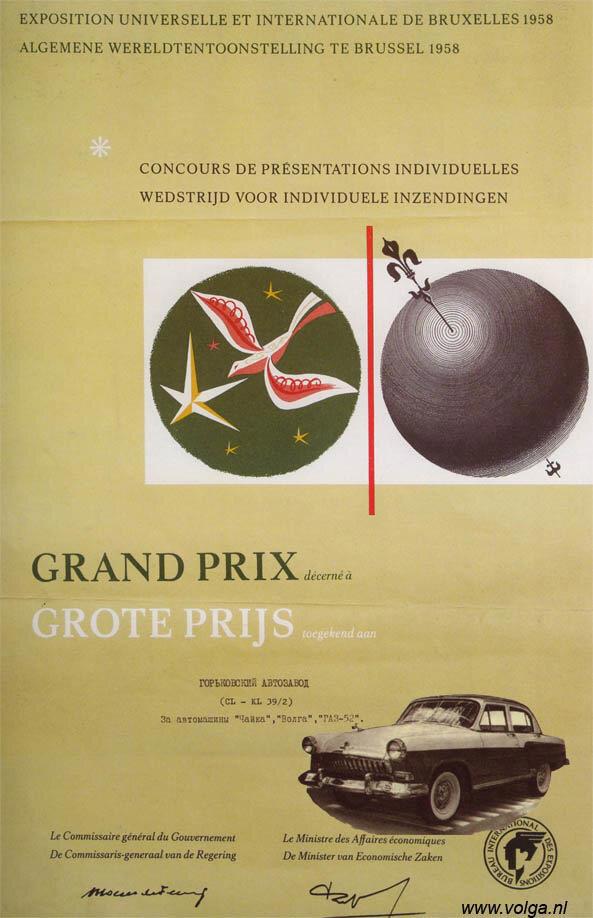 Итак,то была ТАКИ МЕЖДУНАРОДНАЯ ВЫСТАВКА,а не ВЫСТАВКА ИЗДЕЛИЙ СОВЕТСКОГО АВТОПРОМА.где и конкурентов,дескать , не имелось,как распинался оппонент..там в частности очень много медалей чехи получили и байки про то,что тогда не АВТОМОБИЛИ получили приз,а приз дали за ОФОРМЛЕНИЕ СТЕНДА,байками и являются...на международных автовыставках не дают призов ЗА ОФОРМЛЕНИЕ ЭКСПОЗИЦИИ...да и сертификаты с той выставки тоже имеются -легко читается - "ГРАН -ПРИ" (копия наградного документа выставке, размещенную на нидерландском сайте: http://www.volga.nl/medailleEN.htm):