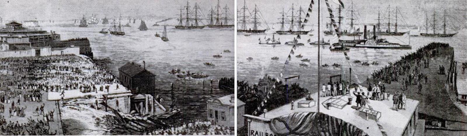Русский флот стоит на якоре в Нью-Йоркской гавани рядом с американскими судами в 1871 году Более ранний визит русского флота, во время Гражданской войны, был расценен Севером как жест дружбы, когда опасались, что британский флот может прорвать блокаду Севера со стороны Юга. История российско-американских отношений была особенно счастливой.
