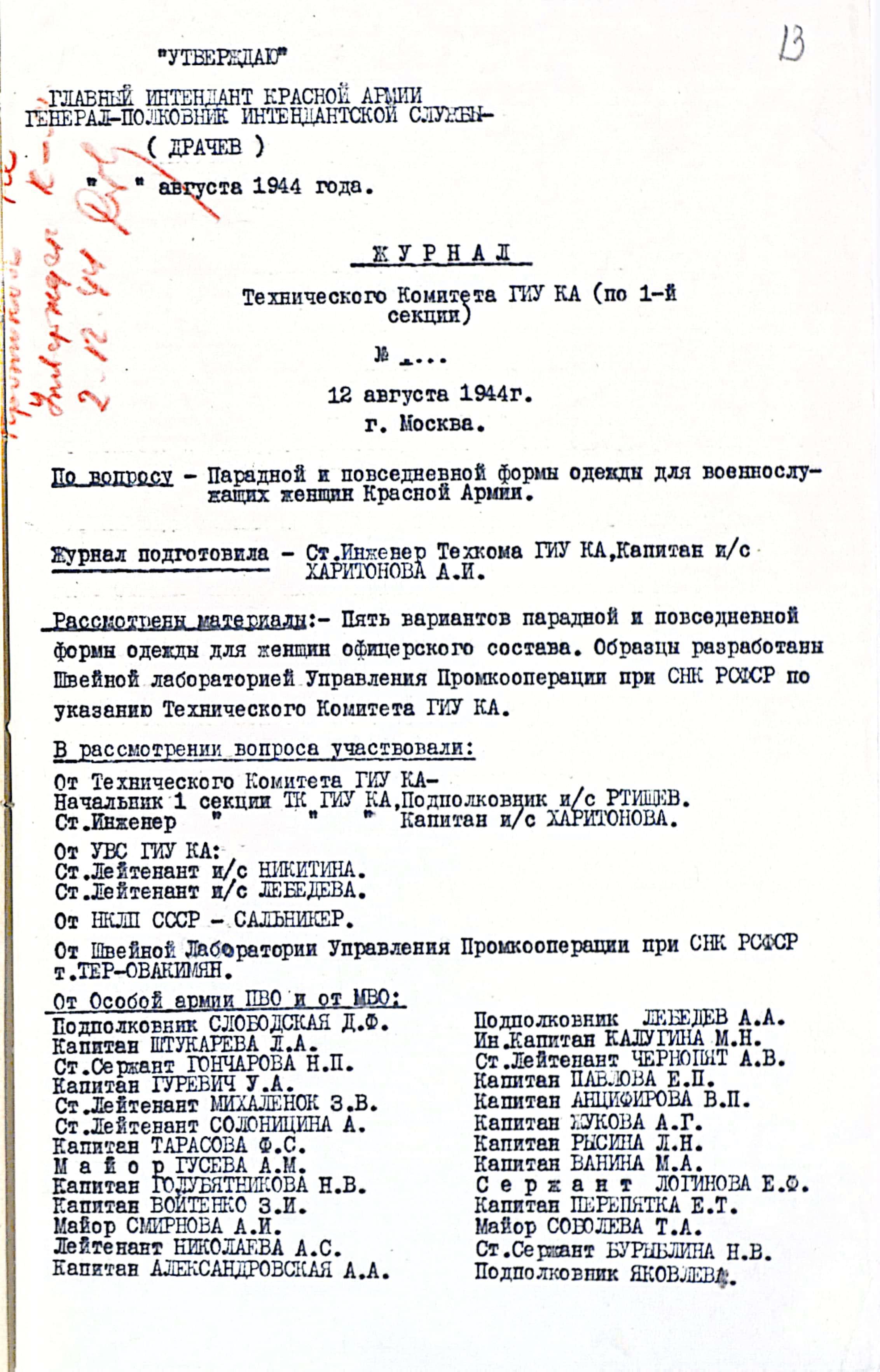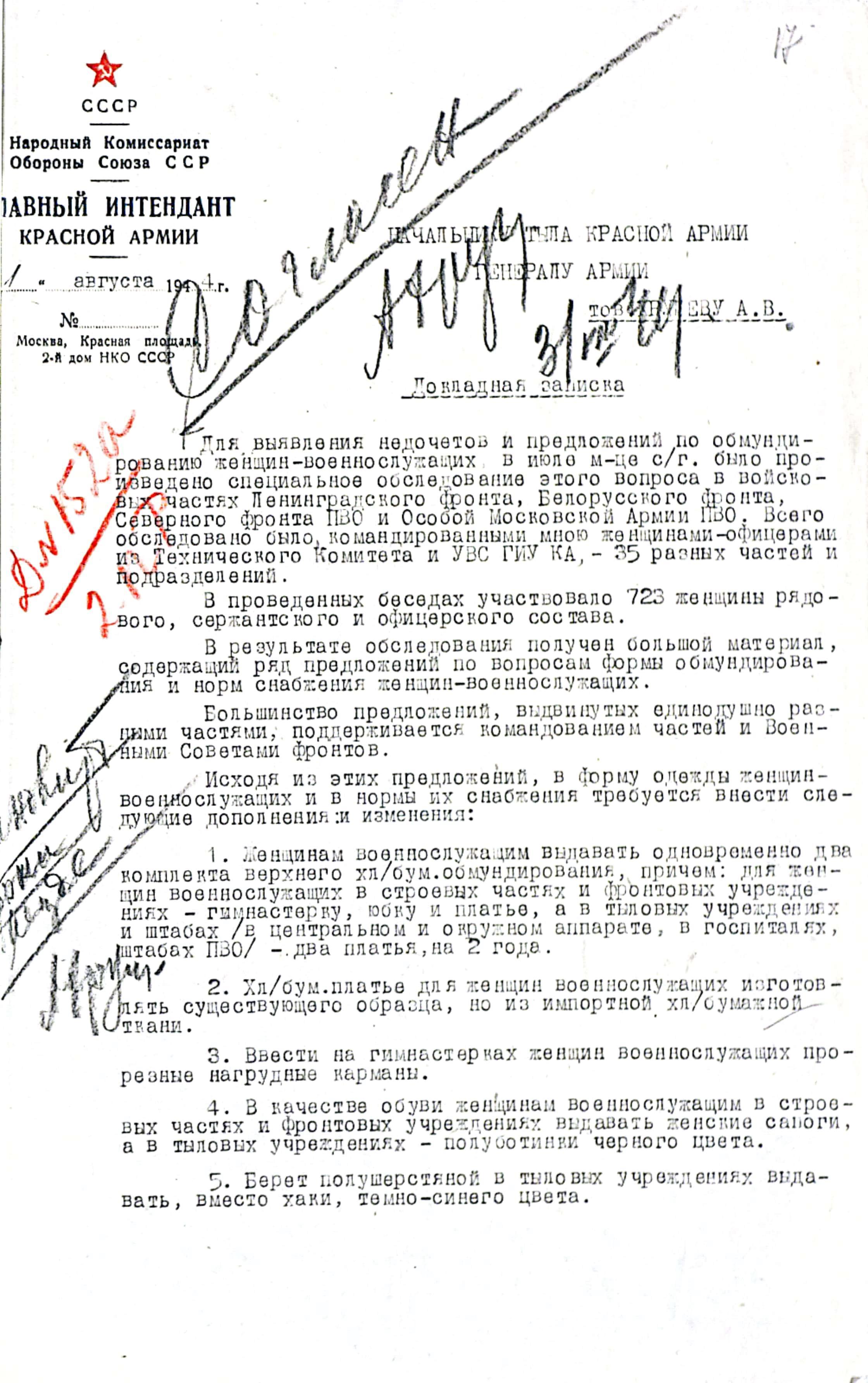 Анализ поступавших предложений показал, что необходимо срочно начать переработку действующих нормативов, начав работу с уточнения порядка обеспечения обмундированием военнослужащих женщин. Главным Интендантом КА генерал-полковником и/с П.И. Драчёвым, было отдано указание о проведении специального обследования по выявлению недочётов и проблем. В целях выполнения распоряжения, Управление вещевого снабжения и Техком ГИнтУ откамондировал из своего состава на фронты женщин-офицеров. Представительницы Главного Интендантского Управления провели большую работу, побывав в 35 воинских частях и опросив более 700 женщин военнослужащих. Результаты обследования, Главный Интендант КА доложил начальнику Тыла Красной Армии генералу армии А.В. Хрулёву: