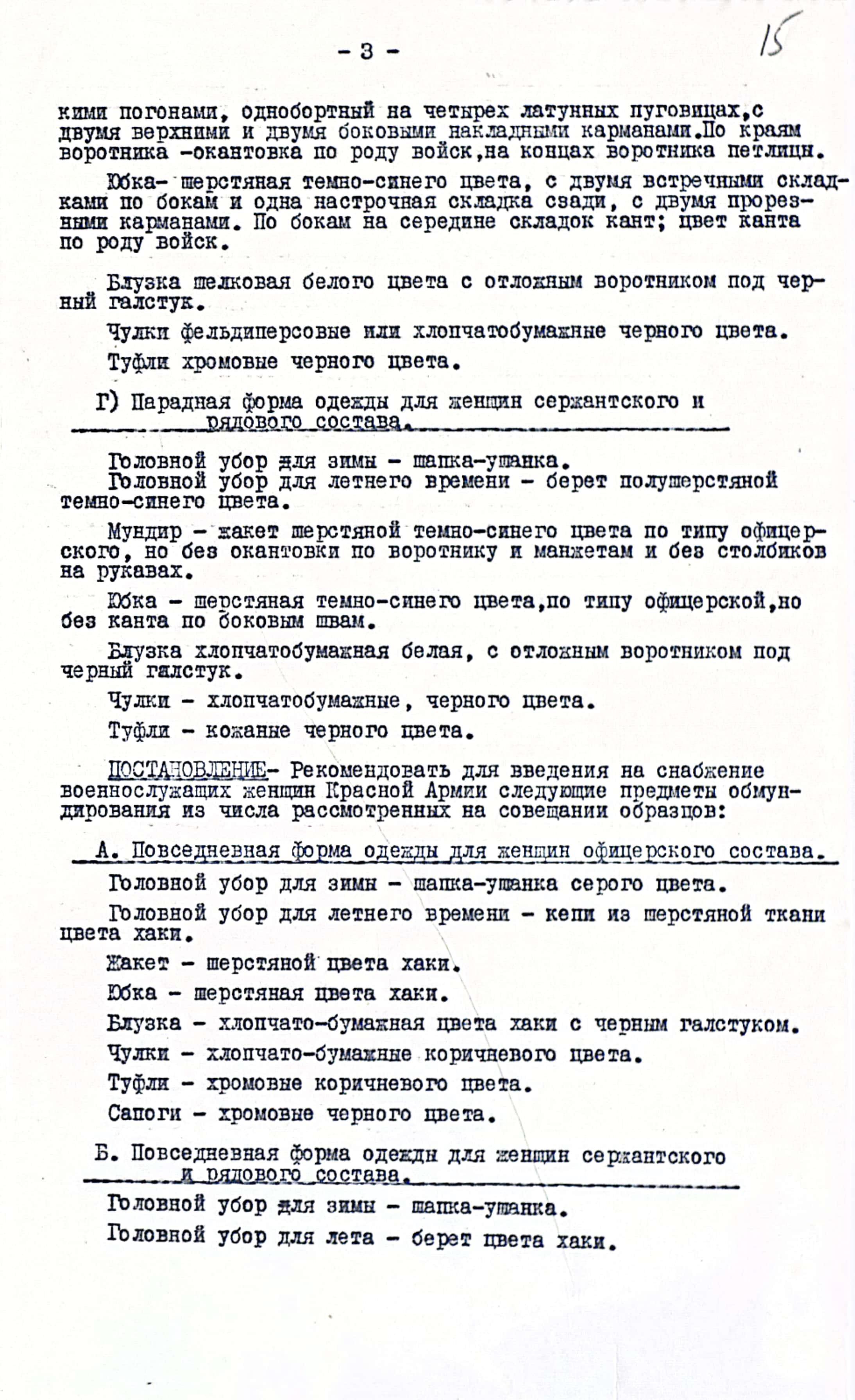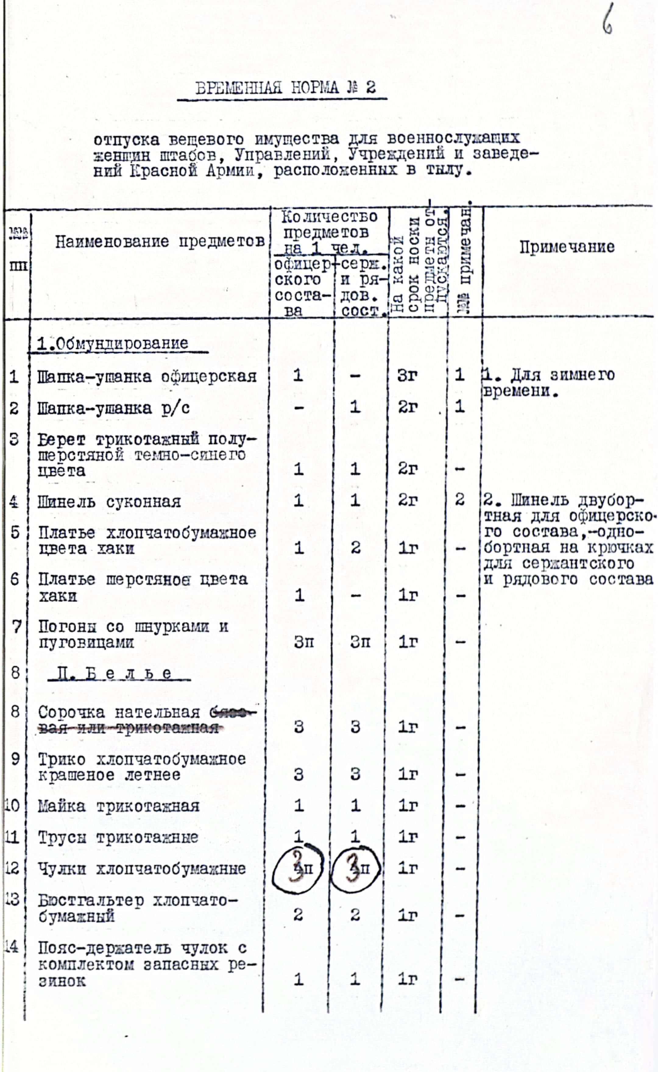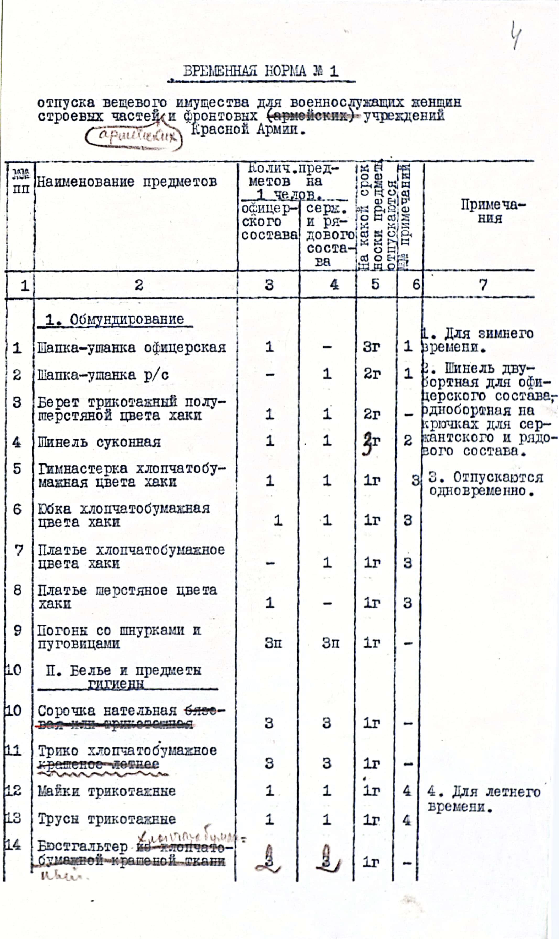 Первая норма содержала перечень предметов и сроки их носки для военнослужащих женщин строевых частей армейских и фронтовых учреждений:
