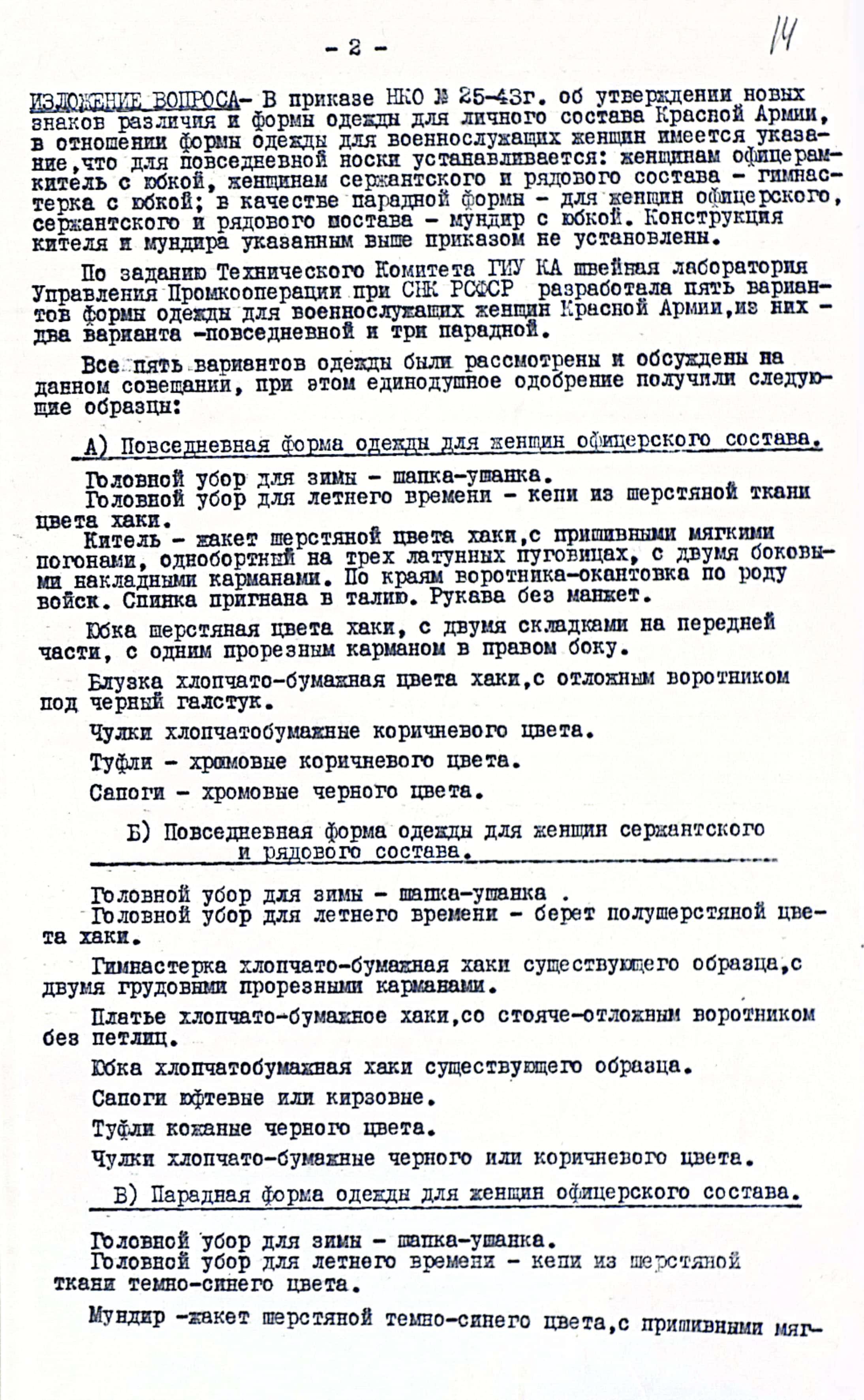 Параллельно с изучением мнений, велась работа и по разработке новых предметов парадной и повседневной формы одежды для женщин военнослужащих РККА. К разработке приивлекалась Швейная лаборатория Управления Промкооперации при Совете Народных Комиссаров РСФСР. Ими было разработано пять вариантов парадного и повседневного обмундирования для женщин. К сожалению, найти описания всех вариантов не удалось, в архиве сохранился документ, в котором имеется описание только тех образцов, которые получили одобрение совместной комиссии: