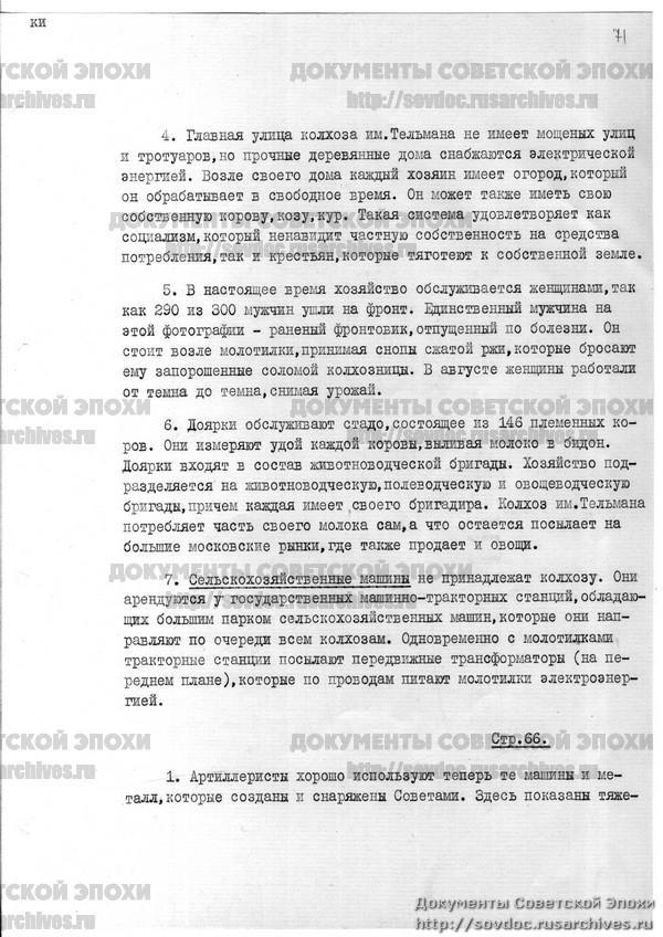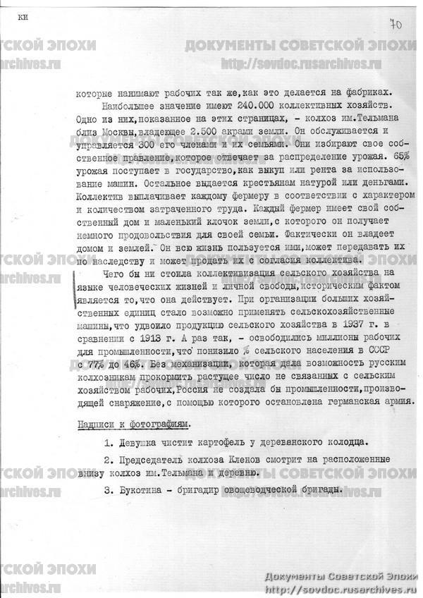 На этих страницах изображен колхоз имени Тельмана площадью 2500 акров под Москвой. На нем работают и контролируются 300 его членов-фермеров и их семей. Они горячо избирают свое собственное руководство, которое отвечает за выполнение коллективных квот на урожай. Шестьдесят пять процентов урожая поступает государству в виде налогов или арендной платы за технику. Остальная часть выплачивается фермерам либо продуктами, либо наличными. Коллектив платит каждому фермеру в соответствии с видом и объемом выполняемой им работы. У каждого фермера есть свой собственный дом и небольшой участок земли, на котором он выращивает часть продуктов питания для своей семьи. На самом деле он владеет домом и землей. Он пользуется ими всю жизнь, может передать их своим наследникам и может продать их с согласия коллектива.