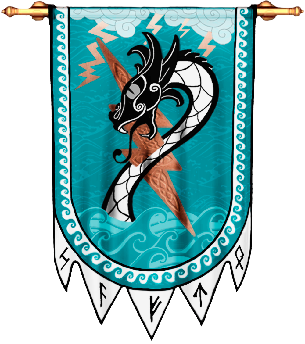 Автор: Тимур МарковНаконец закончил серию артов с геральдикой благородных Домов Логрии. Последний кирпичик - знамя и щит дома Эйл Тон, повелителей ветров и бурь. Они прославленные мореходы, единственные из всех, кто черпает силу в море, эдакие местные викинги, что и отражено в их символике.