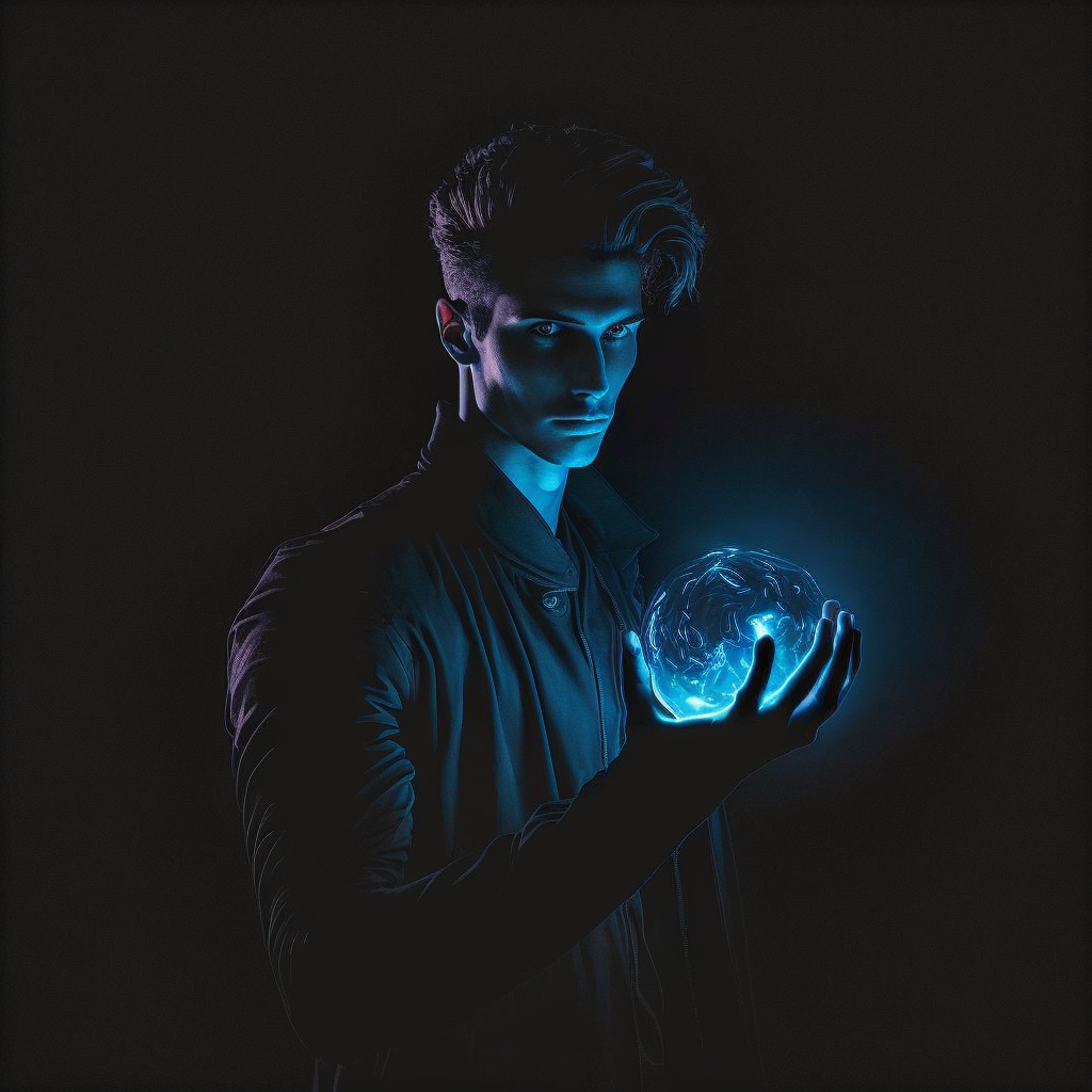 prompt: (black background), (everything black), human, standing poseture, (cool pose), hand, light in hand, (lightball), (blue light), ((realistic shadows)), (((superrealistic lights)))