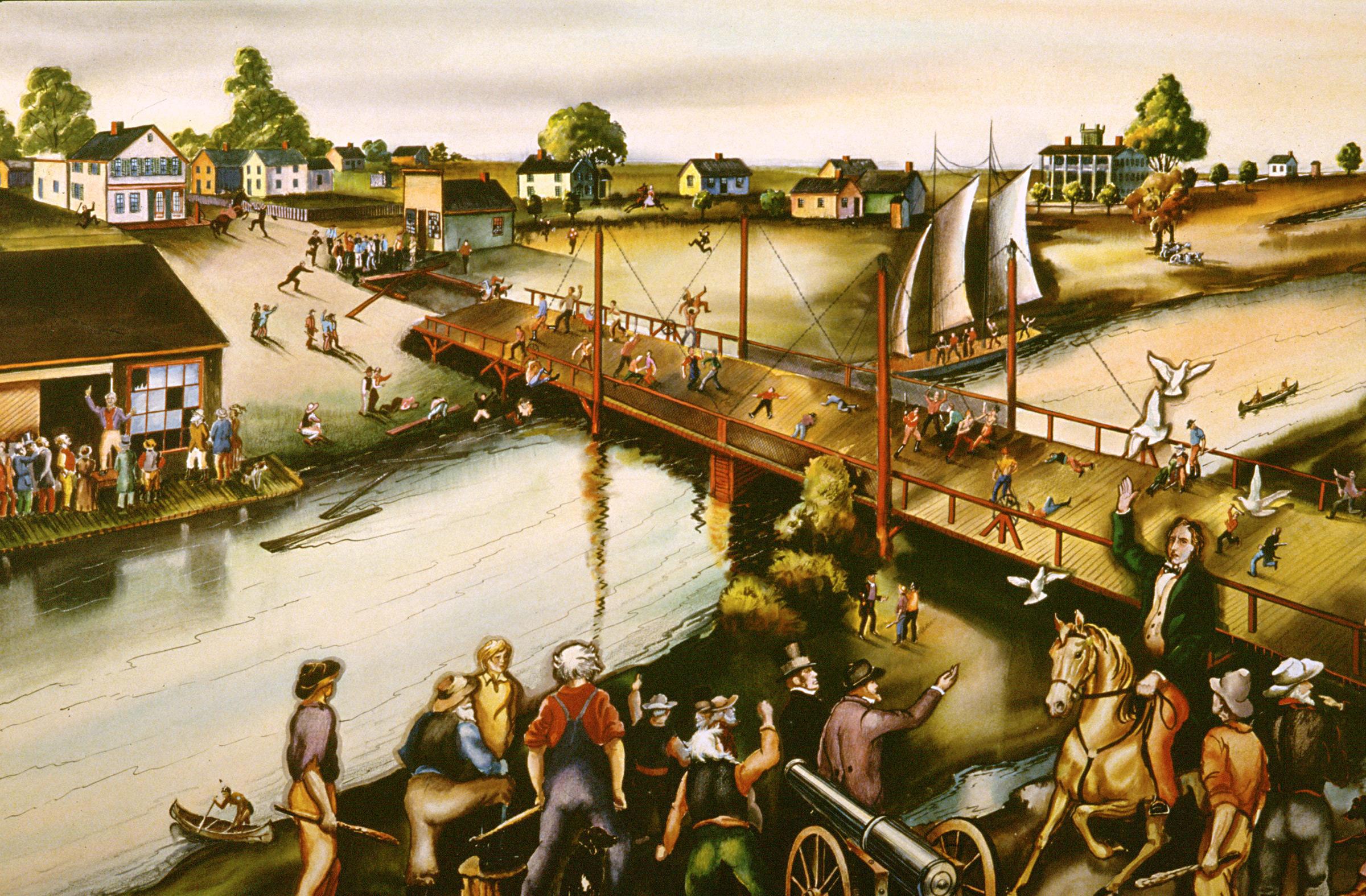 3 мая 1845 года одна из шхун врезалась в мост на Spring Stree – тот единственный, который устраивал Килборна. «Западники» решили, что это «восточники» подготовили капитана на диверсию… и в ответ решили разобрать мост на Chestnut Street. И разобрали – правда, только свою «западную» часть, но мост почему-то обиделся и рухнул весь. В ответ «восточники» взялись за оружие, в том числе нашли где-то пушку, которую за неимением нормального ядра зарядили гирями от часов. Правда, стрелять из неё все-таки не стали, но зато доломали мост на Spring Stree, а заодно и мост через Меномони (тот, что Килборн пытался построить первым). Ну, чтобы этим, на другом берегу, жизнь медом не казалась.