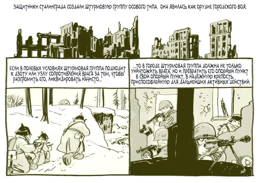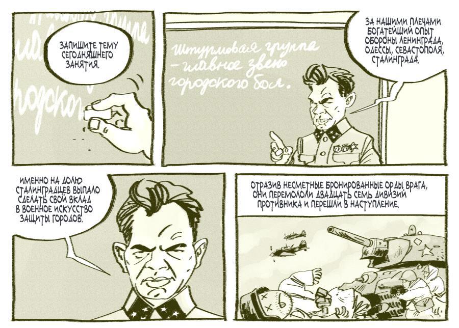 Автор: Николай БергВ. Сахнов: Внезапно начал рисовать комикс по статье г.-л. В.Чуйкова, опубликованной им 2 января 1943 года в газете "Сталинское знамя".