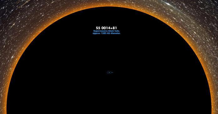Самая крупная черная дыра, известная человечеству, носит название FSRQ блазар, находится в галактике S5 0014+81 и выполняет роль ее ядра. Объект отдален от Солнечной системы на 12 млрд световых лет.