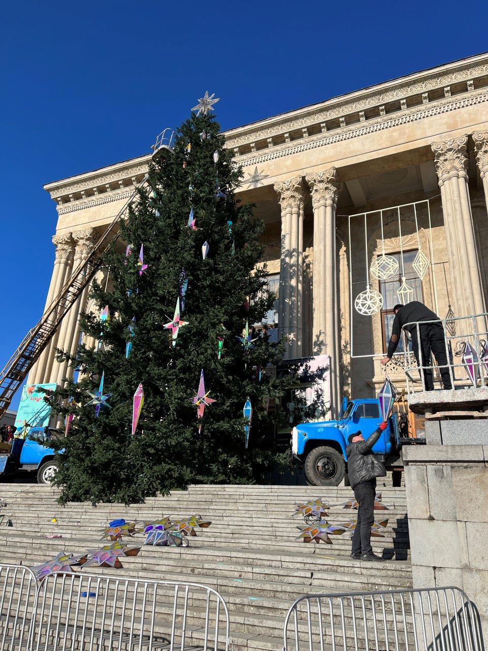 В центре, перед драматическим театром, украшают ёлку. Может она добавит новогоднего настроения?
