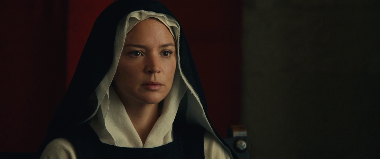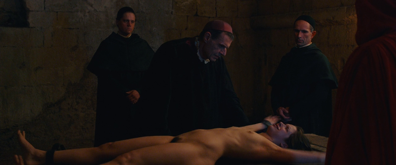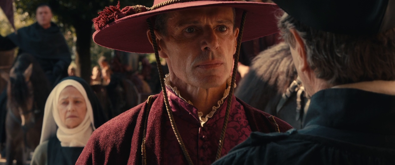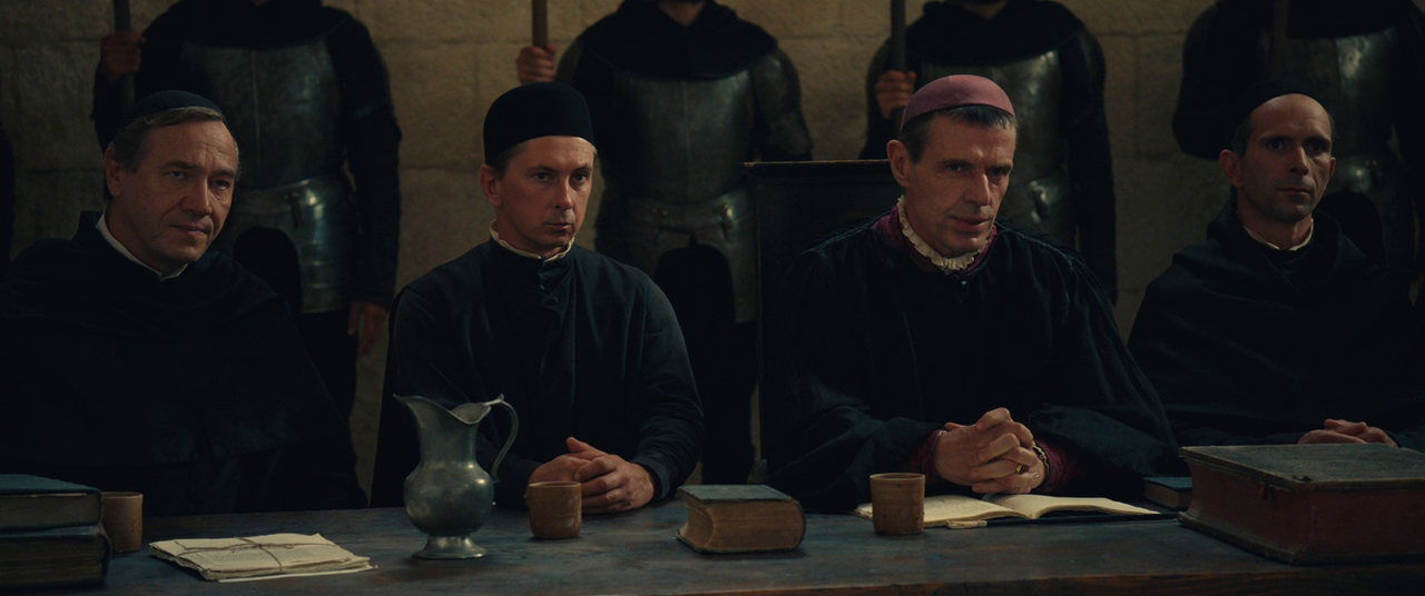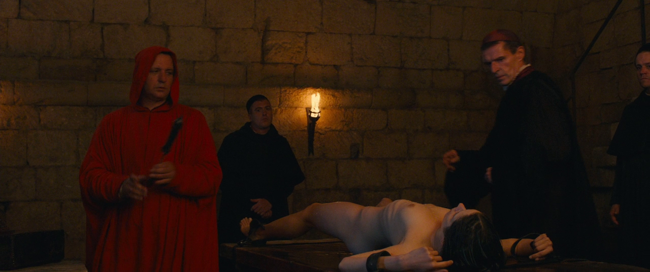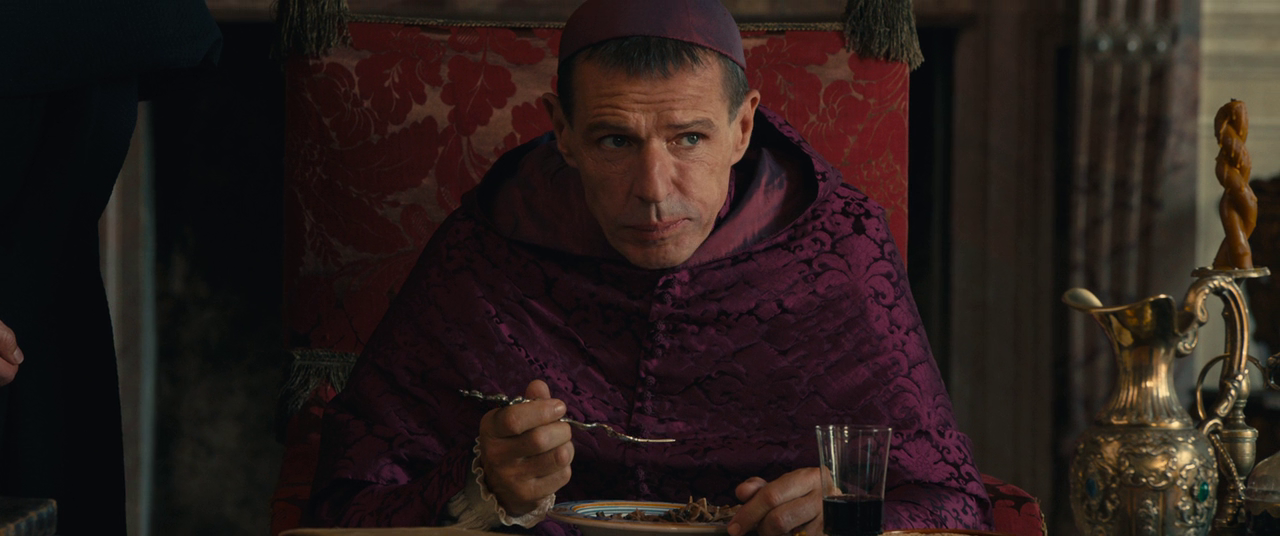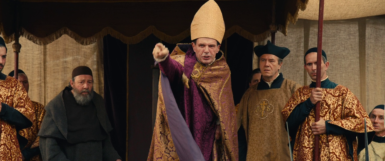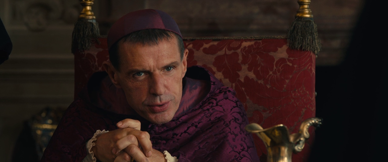 Именно так я себе представлял инквизитора Бернарда Ги в романе "Имя розы". У меня было чувство, что этот инквизитор в фильме словно сошел со страниц романа Умберто Эко. Колючие, проницательные глаза, определенная манера разговаривать и держаться. В фильме он выступает, как условный антагонист, но каким-то особым злодеем его назвать тяжело, по крайней мере мне. Он принимает крайне взвешенные решение, сначала хорошо во всем разбирается, прежде чем выносить приговор. В женском монастыре он наводит самый настоящий кипиш, проводит там расследование, чтобы выяснить кто на кого наговаривает клевету, а кто действительно совершает преступление против церкви и бога. Хладнокровный, неподкупный. хорошо разбирающийся в людях. При этом сам он совершенно искренне верит в бога, это не какой-то там циничный карьерист. При этом, он вызывает реальное чувство страха и отвращения.