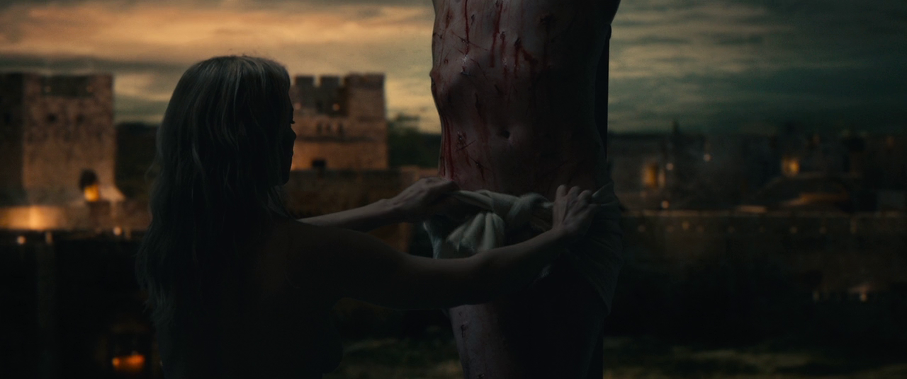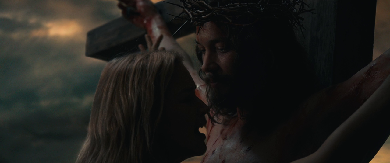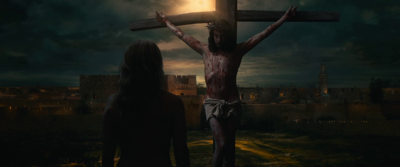 Ей снится, что она голая поднимается на Голгофу. На вершине крест, на котором висит Иисус, истекающий кровью. Она становится перед ним на колени, а он говорит ей: "Раздень меня". Она снимает с его бедер ткань и разглядывает все там. Затем она встает, обнимает окровавленного Иисуса и прикладывает свои ладони к его пробитым гвоздями ладоням, начинает чувствовать в своих руках его боль. Невероятная красота. Дедушка Фрейд аплодировал бы.