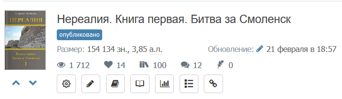 Автор: Сергей МатвеевПервый маленький юбилей: сегодня, аккурат ко всемирному Дню писателя, число подписчиков (библиотек) на Нереалию достигло 100 человек! Книга этого заслуживает, на самом деле, как и любой писатель "о своём детище", могу сказать, что книга заслуживает и 1000, и 10000, и так далее. Просто всё постепенно, пока выложены лишь первые семь глав. И только первой книги из серии. Так что желаю Нереалии новых заслуженных побед! И приглашаю всех друзей присоединяться к кругу читателей! :)