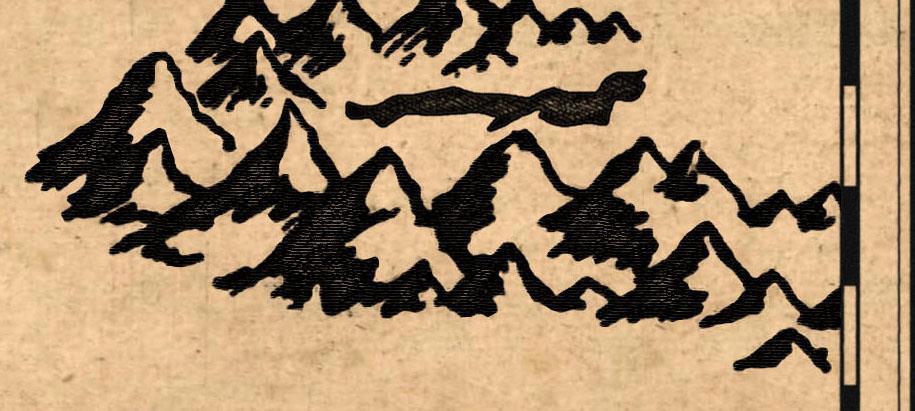 Дальше пора бы уже и за Землю-матушку взяться. В карте де Вита города и веси обозначены унылыми кружками, что для моей фентезни не особо годится, так как не смотрится пафосно. Горы у него тоже скучные и печальные. На других картах тоже - там не горы, а какая-то картошка. Мне же непременно требовались грозные остроконечные пики. Я перепробовал множество разных вариантов, нашёл в процессе классный сайт http://www.fantasticmaps.com/ с набором обучалок по рисованию карт, правда, традиционным способом, пытался сделать контура с фотографий реальных гор, пока наконец не додумался взять несколько фентезийных карт с характерными хребтами и, основываясь на их форме, нарисовать свои, особо ничего не выдумывая. Далее оставалось только применить к ним комбинацию фильтров "волшебный карандаш" и "уголь" и получить вот что: