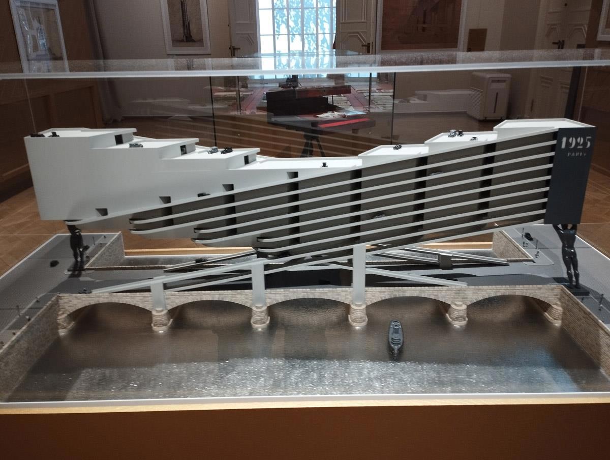 Показали овердофига, начиная со студенческих работ и набросков, живописи, почти всех его проектов. Даже саркофаг Ленина в отдельный зальчик впихнули (самое интересное там — чертежи гидрозатворов). Несколько макетов («Махорка», собственный дом, тот самый выставочный павильон 1925 года, гениально-безумный проект гаража над мостом в Париже и ты ды).